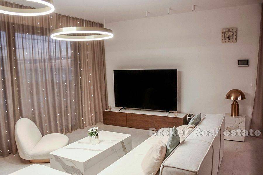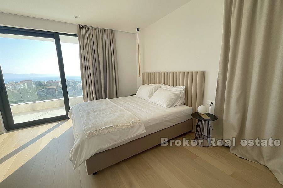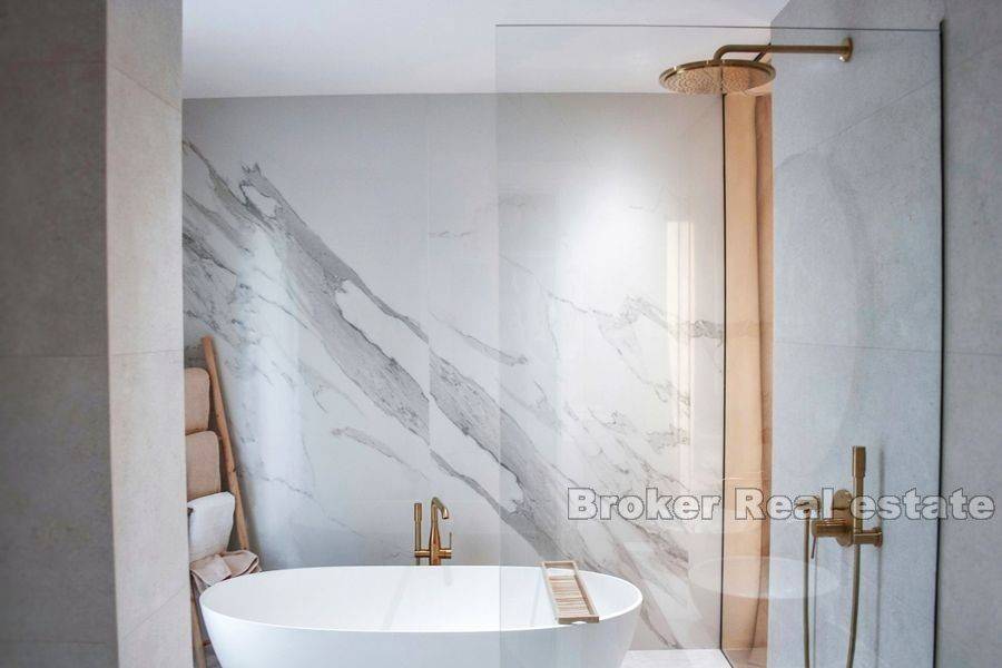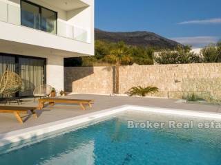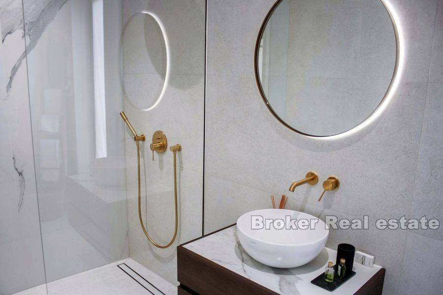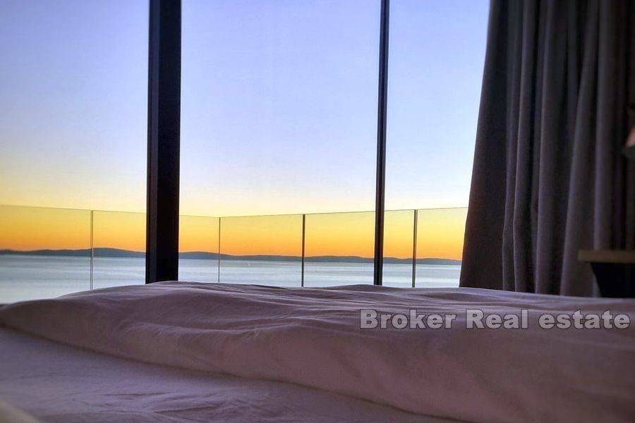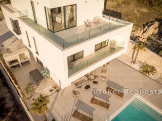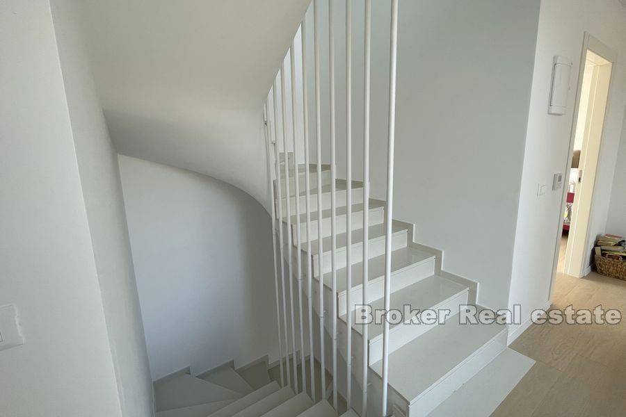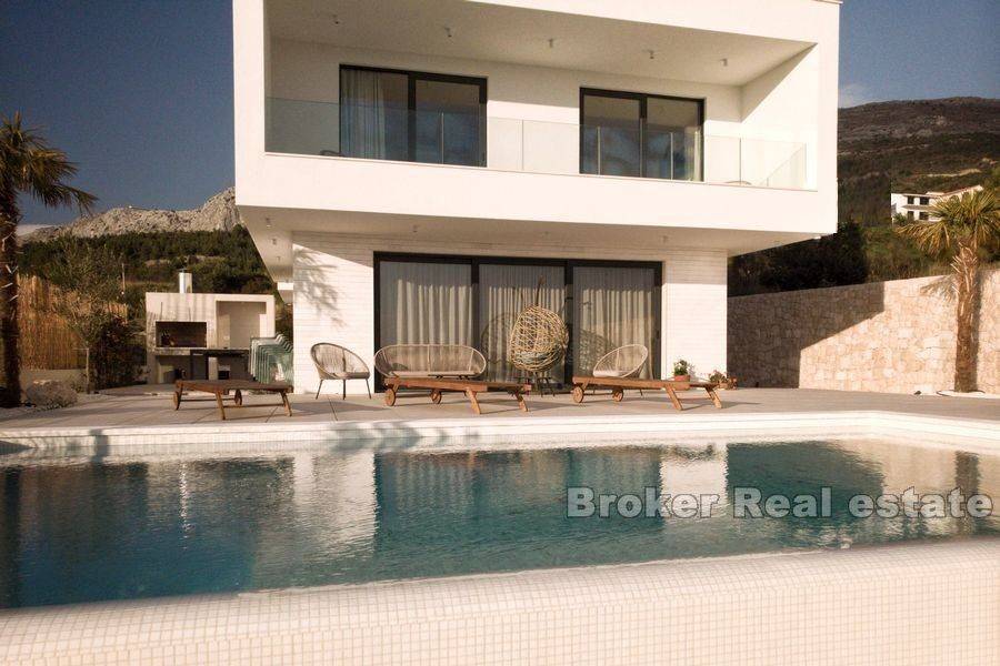 Modern villa located in a very quiet and prestigious location with open sea views. House with a total living area of ​​316 m2 with an overflow pool on a plot of 812 m2. It consists of three modernly equipped floors, and was built in 2021. On the first floor there is an entrance with fitted wardrobes, one bathroom, a spacious living room which is connected to the outdoor area by the pool by sliding glass walls, a kitchen and a dining room. On the second floor there are two bedrooms of 20m2 with an open closet concept and large windows, each with its own bathroom and a common large balcony facing the sea from which there is an amazing view. On the third floor there is a master bedroom that has its own walk in closet and a bathroom that is connected to itself by glass, designed so that after a hard day you can watch the sunset from your own sparkling bath. Each room has a sea view and its own air conditioning, and the bathrooms are underfloor heating. The parquet in the rooms is three-layer, high-quality, bleached Class I oak. Due to the atmosphere in winter, the living area has a large Lenordica fireplace, built-in floor air conditioning and underfloor heating. In the central part of the property there is an olive tree over 60 years old, glazed so that it fits into the living space as a work of art. The villa is for sale fully furnished. All the furniture is made to measure and additionally equipped with designer pieces, the paintings on the walls are the work of art of a local artist. All devices are Bosch, the sanitary ware is gilded, Grohe brand. The table and the surface of the kitchen island are made to order from marble and quartz in order to be as durable and resistant as possible. Additional appliances in the kitchen include a large wine cooler and ice maker. There are also solar panels on the property, and a robot for cleaning large glazed areas comes with the house. The Infinity pool can also be used in the winter months as it comes with built-in heaters. The 50x3m long external stone wall is handmade from Dalmatian stone according to the drywall principle, the stone has excellent properties and is resistant to external conditions. In the outer courtyard there is also a large barbecue with space for relaxation and socializing. The intercom can be connected to a mobile phone so no key is required. The property is covered by surveillance cameras, and the property has 4 parking spaces. It is 650 meters away from the sea, located in an urban area around Split in a quiet neighborhood. It is 12 km away from Split, in the immediate vicinity there are shops, pharmacy, cafes, beach. It is an ideal investment if you want a perfectly carefully designed property in which a lot of effort and love has been invested to the last detail, so that it can be used for life but also for tourist rentals in the summer months.