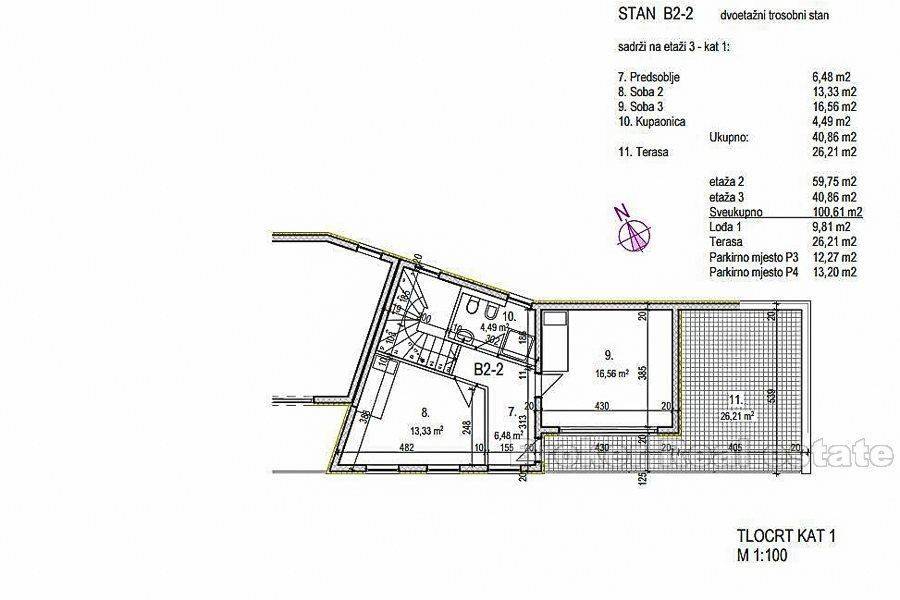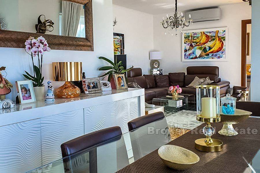 Podstrana, for sale is an attractive two-storey three bedroom apartment with sea view. This beautiful apartment is part of a residential project of smaller houses in a row. Each apartment is like a small house on two floors. The apartment consists of ground floor and first floor and both are connected by an internal staircase. On the ground floor there is an entrance with a staircase, a bathroom, a kitchen with a dining room, a living room, a bedroom and a loggia. On the first floor there is a bathroom, two bedrooms and a glazed terrace as a luxury living room with a glass roof. There is a lot of investment in the equipment of the apartment, so the apartment is really quality real estate comfortable for living in a slightly isolated location. In front of the apartment there are two covered parking spaces.