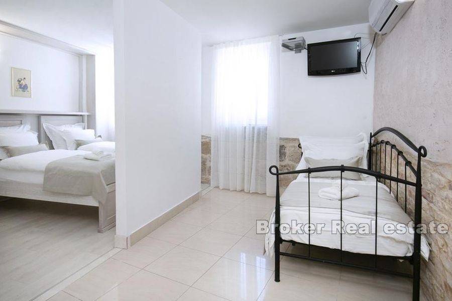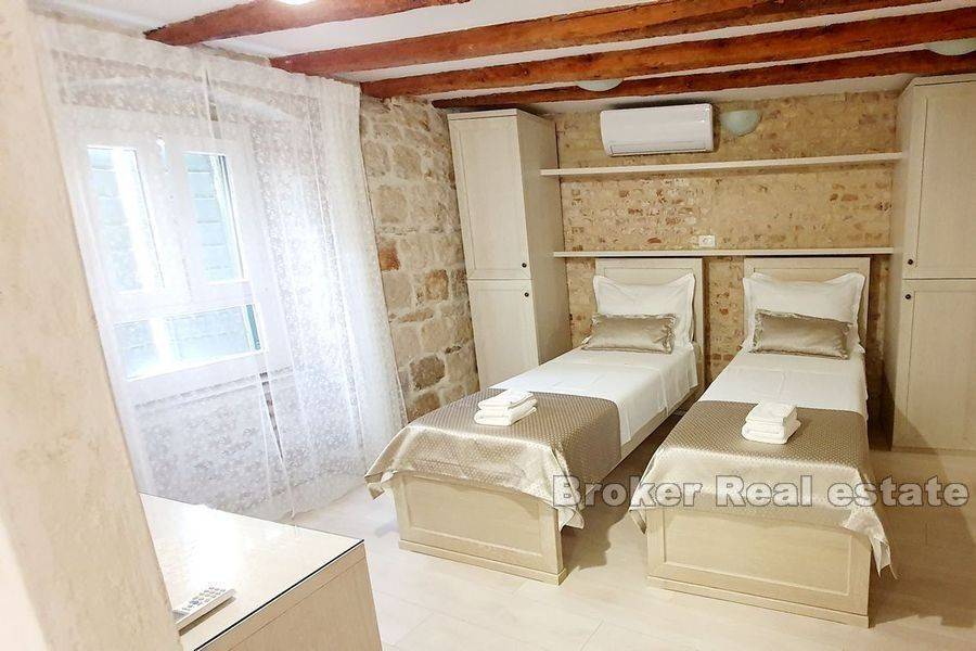 UNESCO-protected traditional Dalmatian stone house. Located in the city center, in a quiet location and also near the waterfront, the sea and Diocletian’s palace. The house consists of five accommodation units spread over three floors. On the first floor there is a reception and two bedrooms with bathrooms. On the second floor there are two bedrooms with bathrooms. On the top floor, which is reached by external stairs, there are two studio apartments with a shared terrace. All units are comfortable and airy. Air conditioned and fully equipped. The interior of the building has been redecorated with a beautiful modern design retaining the original parts such as wooden beams and stone walls. The property is rented tourism and has a very good established business, excellent occupancy and guest ratings.There are many restaurants, shops and public parking nearby.