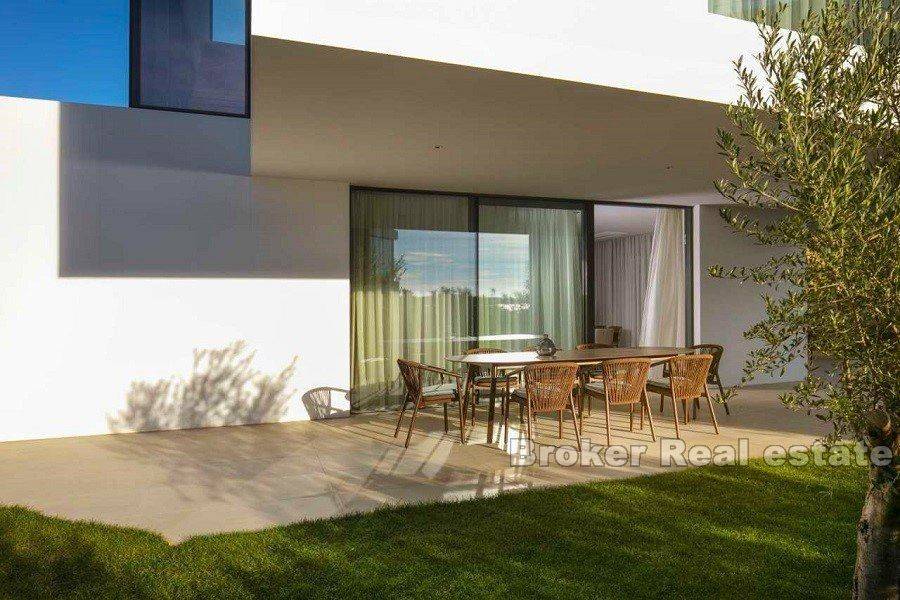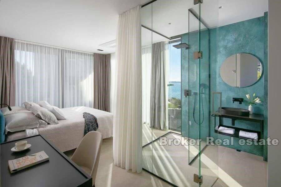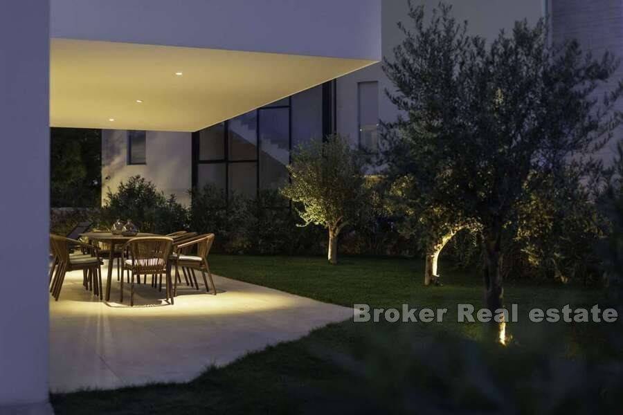 Zadar modern luxury villa near the sea and the beach. The entire villa and its yard exude quality and luxury, where every detail was thought of during construction and decoration. The villa is spread over 4 floors that are interconnected by an internal elevator. – The basement consists of a room designed as a playroom. There is also a bar, a toilet and a laundry room. – The ground floor consists of a kitchen, dining room, bathroom and a large open-concept living room with access to the yard, where the 45m2 heated swimming pool stands out, which allows the new owners to enjoy it almost all year round. – Upstairs there are three rooms, each with its own bathroom and exit to the terrace with a view of the sea – On the second floor there is another bedroom with a bathroom and a wellness area designed as a corner for relaxing and enjoying sunrises and sunsets. The villa is located in an attractive location near the beach and the sea, a few minutes away by car from the city of Zadar.