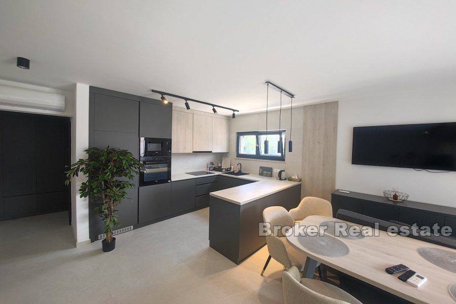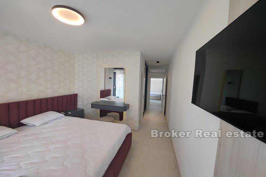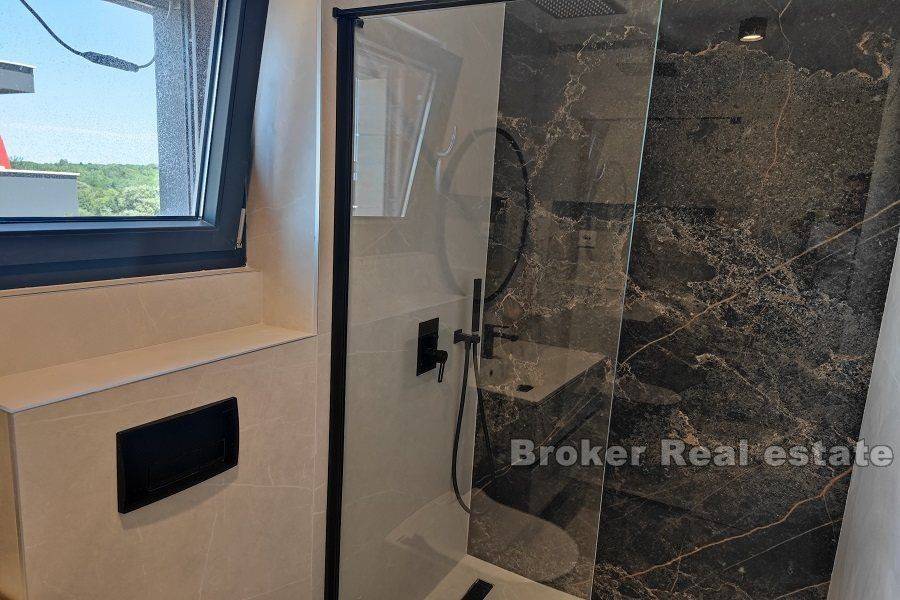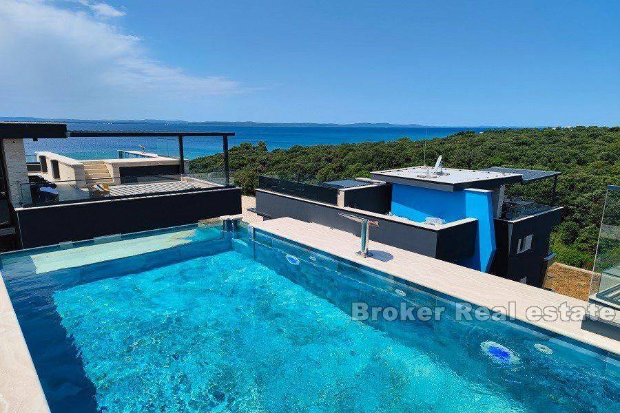 Zadar luxury apartment villa near the beach and the sea The villa is of top quality and standard, fully equipped and furnished. It extends over 4 floors: – In the basement there are 3 one-room apartments of 30m2 each – On the ground floor there is a three-room apartment of 90 m2, which consists of a living room with a kitchen and a dining room, a hallway, 3 bedrooms with bathrooms and 2 loggias. – On the 1st floor there is also a three-room apartment of 90 m2, which consists of a living room with a kitchen and dining room, a hallway, 3 bedrooms with bathrooms and 2 loggias. – On the 2nd floor there is a 140m2 penthouse, consisting of a living room with a kitchen and dining room, a hallway, 3 bedrooms with bathrooms, 2 loggias, and a roof terrace with a summer kitchen, swimming pool and jacuzzi. The villa is built on a plot of 500m2, on which there is another swimming pool and parking space. If necessary, there is the possibility of purchasing additional land of 1,700 m2 on which new sports and tourist facilities could be built. Residential location, close to all amenities, as well as close to the airport and highway.