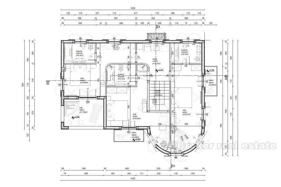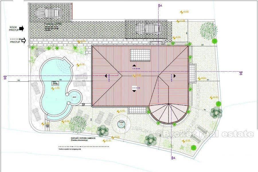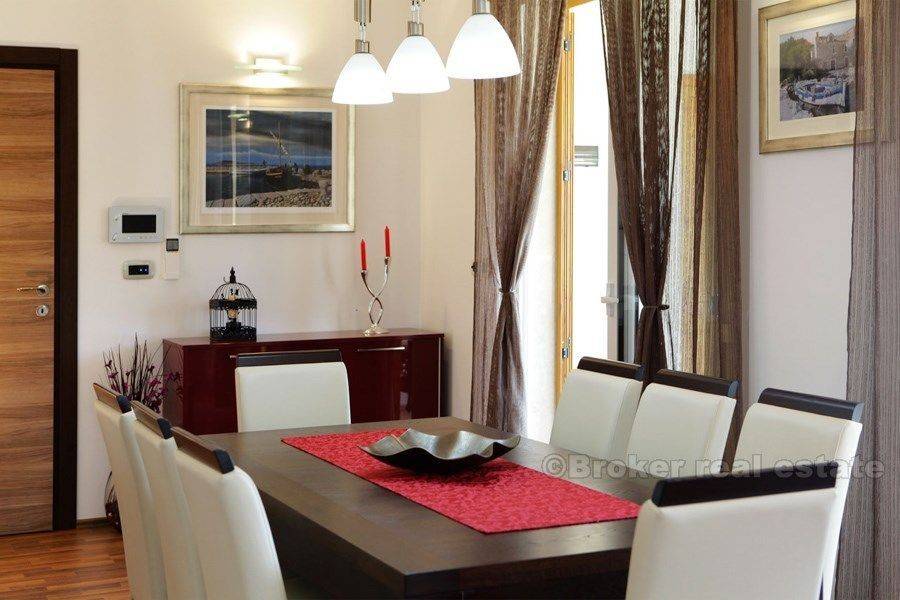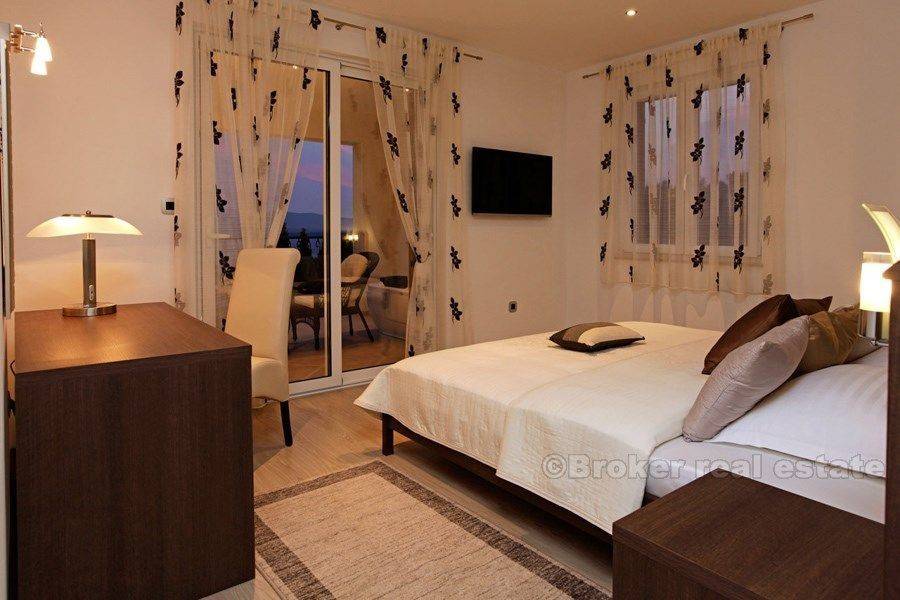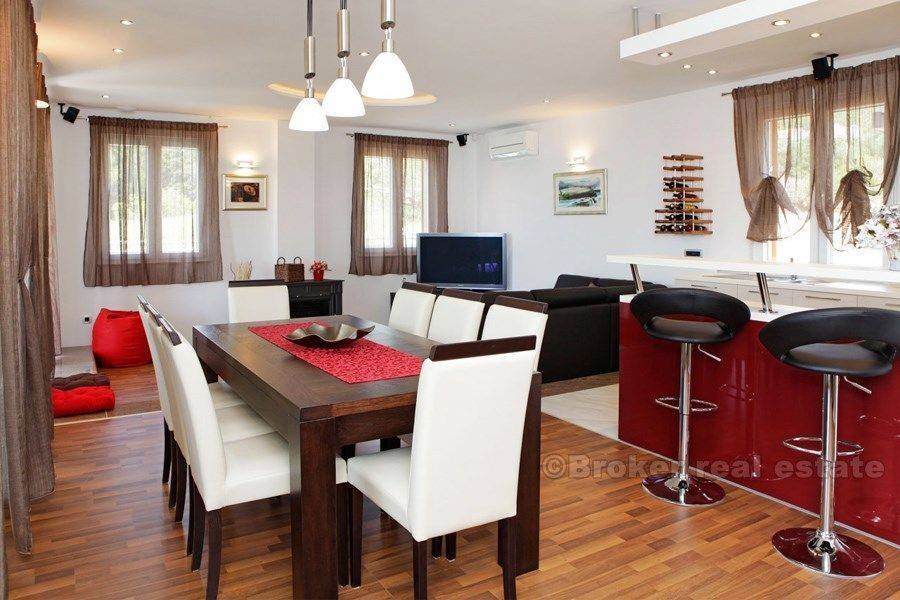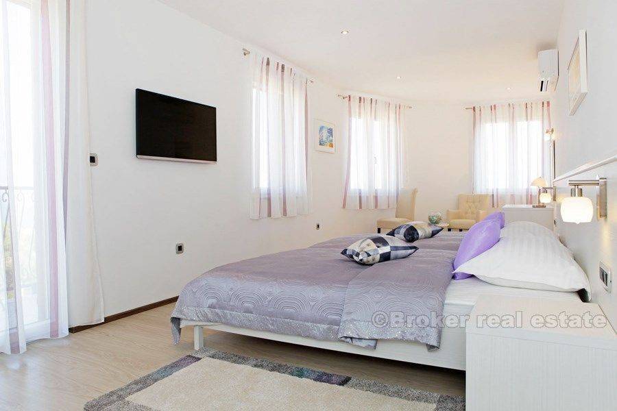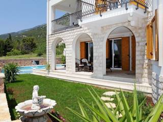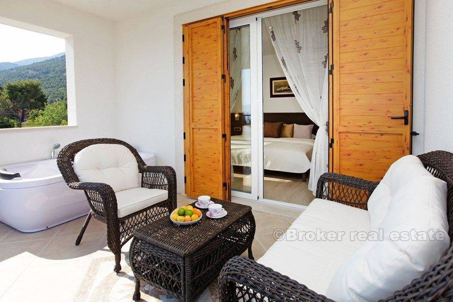 This luxury villa with swimming pool and fantastic sea view is situated in an excellent location (island Brac), only 400 m from the sea. The villa was built in 2015. on a 500 m2 plot. It is spread over three floors with 250 m2 of perfectly designed living space. It consists of a kitchen, dining room, beautiful living room, four spacious bedrooms, each with private bathroom. The villa is equipped with top-quality equipment including floor heating, air condition, video surveillance, alarm system, sound insulation. A beautiful garden, ideal for socializing, includes swimming pool with a waterfall, sunbathing are, barbecue and terrace. Unique and quiet location, which offers complete privacy, only 900 m from Bol promenade, proximity of the beach and all necessary facilities (shops, bus station, restaurants, bars, market) make it ideal for a quiet holiday and full enjoyment in Adriatic, but also it is an exceptional business investment as villa has already established rental business and it is categorized with 5 stars.