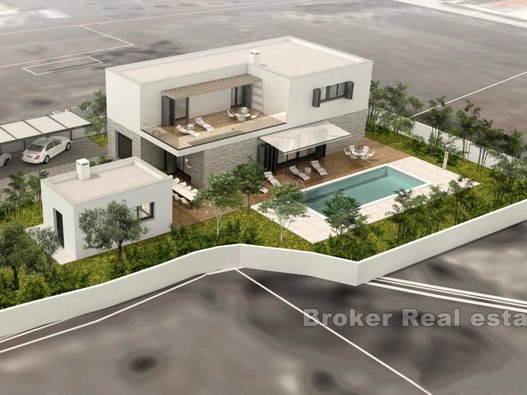 An unfinished house with swimming pool is for sale, located in an excellent location in Kaštela, in a quiet environment, yet close to all the necessary amenities for a pleasant life or vacation. This spacious and attractive property covers a living area of ​​418 m², while it is located on a large plot of 1173 m², which allows for numerous design options and additional amenities. The house consists of a ground floor and a first floor.   Ground floor: The ground floor of the house is designed for maximum functionality and comfort. It features a spacious living room with plenty of natural light, perfect for relaxing and socializing, a modern kitchen with a dining room, suitable for family meals and gatherings with friends, a comfortable bathroom, one spacious room, which can serve as a bedroom, study or guest room, a large garage with direct access to the house, providing convenience and security. The first floor houses the intimate part of the house, which includes: two spacious rooms, bright and functional, ideal for sleeping or working spaces, a master bedroom with its own bathroom, providing additional luxury and privacy, another bathroom, modern and practical, a spacious balcony and a large terrace of 44 m², ideal for relaxing in the fresh air or enjoying sunny days.   The grounds of this property are extremely spacious and carefully planned. They include: covered parking spaces for four cars, ensuring practicality and protection of vehicles, a children’s playground, ideal for safe and cheerful outdoor time, a summer kitchen with barbecue, an additional kitchen and a toilet, which is perfect for socializing and family celebrations.   The house is being sold unfinished, which allows future owners to adjust the finishing works according to their own wishes and needs. The infrastructure, including water, electricity and sewage, has already been brought to the house, which makes it easier to continue the works.   The property is situated in an attractive and quiet location, and all necessary amenities such as shops, schools, beaches, restaurants and public transport are nearby. This position allows for a pleasant everyday life and makes it ideal for year-round living, weekend breaks or as a lucrative investment for tourist rental due to its proximity to the sea.   This spacious, modern and functional house with great potential offers the perfect combination of quality, spaciousness and location. Whether you are looking for a home for yourself and your family or an investment opportunity, this property meets all the requirements for a comfortable and quality life.