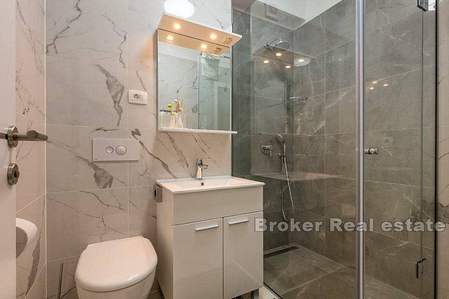 The south-facing apartment house is located in an attractive location in Rogoznica, 50 m from the sea. The house with a living area of 389 m2 is located on a plot of land of 858 m2 and has a basement and three floors. In the basement of 60 m2 there is an apartment consisting of a kitchen, living room, bedroom and bathroom. On the first floor there are two apartments of 60 m2 consisting of two bedrooms, a kitchen with a living room and a bathroom. Each apartment has access to a loggia of 15 m2. The second floor consists of a spacious apartment with access to a 30 m2 balcony that offers an impressive open view of the sea. The apartment consists of four bedrooms, a kitchen with dining room and living room, and one bathroom. On the third floor there is a studio apartment of 40 m2 with a spacious terrace where a jacuzzi is planned. A spacious landscaped garden offers the possibility of building a swimming pool. Close proximity to the beach and all necessary facilities for living. An attractive offer is the possibility of a tourist business or a residential solution.