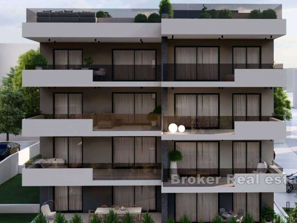 For sale are modern apartments near the sea in Okrug Gornji, on Čiovo. They are located just a few minutes’ walk from the center of the town and from all the facilities on the island that make it an attractive place. The apartments have a southern orientation and are located in a residential building with a total of 4 floors. There are two apartments on each floor, one of which is a two bedroom apartment and the other a three bedroom apartment, each with two bathrooms and a spacious terrace or balcony. Apartments on the ground floor have their own garden, while apartments on the top floor have access to a roof terrace that can be furnished as desired. One outdoor uncovered parking space is provided and an elevator and pool for shared use are also important. Excellent quality materials are used in the construction and heating and cooling takes place through air conditioning in every room and underfloor heating. The apartments are an excellent choice due to the proximity of all amenities and the airport, which is only 9 km away. LOW GROUND FLOOR: S1 – 83.30 m² + terrace 12.10 m² + garden – SOLD S2 – 55.46 m² + terrace 7.31 m² + garden – SOLD HIGH GROUND FLOOR: S3 – 83.30 m² + balcony 12.10 m² – €333,000 S4 – 55.46 m² + balcony 7.31 m² – €253,000 FIRST FLOOR: S5 – 83.30 m² + balcony 12.10 m² – SOLD S6 – 55.46 m² + balcony 7.31 m² – SOLD SECOND FLOOR: S7 – 83.30 m² + balcony 12.10 m² + roof terrace 109.60 m² – €586,000 – SOLD S8 – 55.46 m² + balcony 7.31 m² + roof terrace 70.40 m² – €424,000 – SOLD
