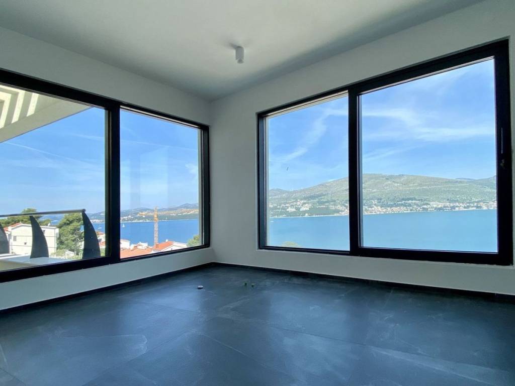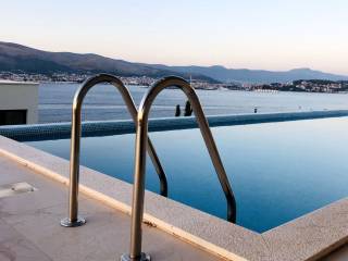 For sale is a modern villa with three floors located on the island of Čiovo. The villa is located on a plot with a total area of 701 m2 and its living area is 361 m2. The ground floor and the entire second floor are open to sunny terraces. The first floor, with a total size of 76 m2, consists of a living room and a dining room with a fully equipped kitchen, and is connected to a terrace with a large heated pool. The underground part is characterized by additional functionality that offers the possibility of decoration. On the top floor, there are bedrooms that offer an enchanting panoramic view of the sea, thanks to additional terraces and large window fronts. The need for the highest quality is also reflected in the interior of the house itself. Only the highest quality materials were used, including large-format ceramic tiles, solid wood parquet and frameless interior doors that further accentuate the tall rooms. The villa has a garage that can accommodate two cars. Near the villa there are all the facilities necessary for life, such as shops, restaurants and cafes. The distance from the sea is only 125 m2 and it is only 8 kilometers from Split airport.