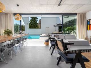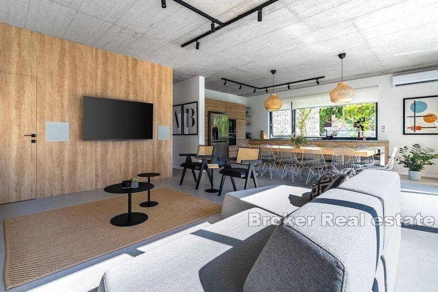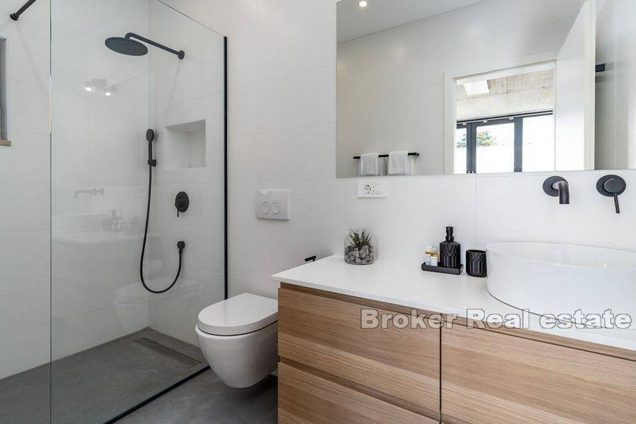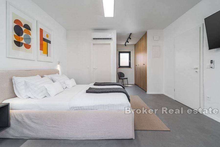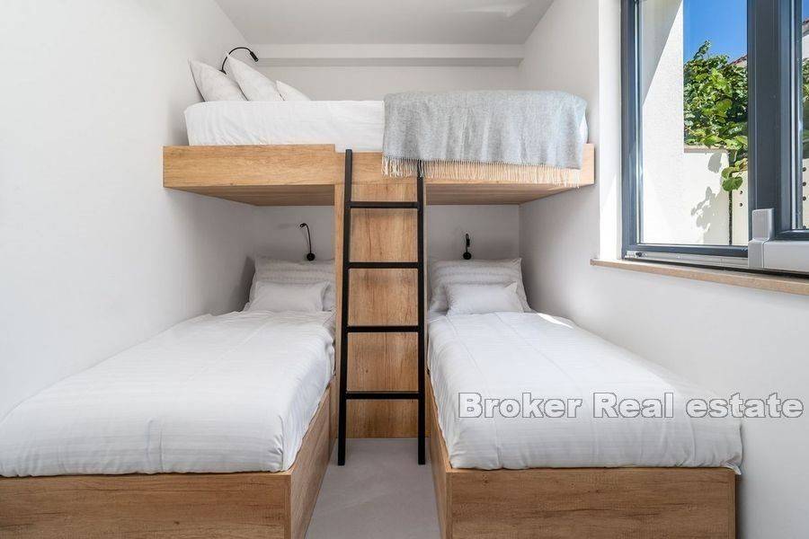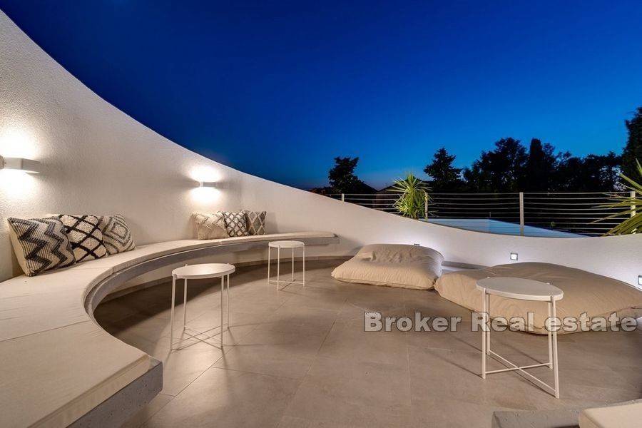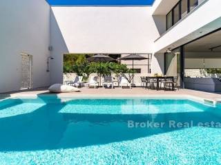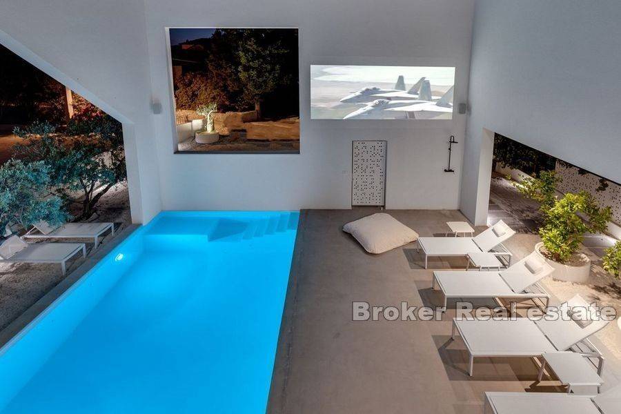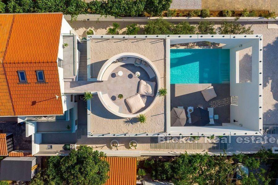 Luxury villa with pool located in a small coastal town on the northern side of Brač, 50m from the sea. Modern design with open white walls surrounding the area around the pool gives a unique look to the villa, which covers 240 m2 of living space with a fenced plot of 481 m2. On the ground floor there is a Finnish sauna, a laundry room, a toilet and an open concept fully equipped kitchen with a dining room and a living room with floor-to-ceiling glass windows that fluidly connect the interior to the pool. Upstairs there are five air-conditioned bedrooms and 4 en suite bathrooms. In the attic there is an air-conditioned room for a home office with all the necessary facilities and a kitchenette. On this floor there is also a terrace with a fenced-in round living room that covers 23.2 m2. The outdoor area is enriched with a heated pool of 34 m2 with a hydromassage, a projector for an open-air cinema, a sun deck, an outdoor dining area and a barbecue. The yard is decorated with olive and citrus trees, which, along with the white walls, provide additional privacy. A 10-minute walk from the town center and a walking distance from the beach make the property an ideal choice for a residential solution or tourist business.