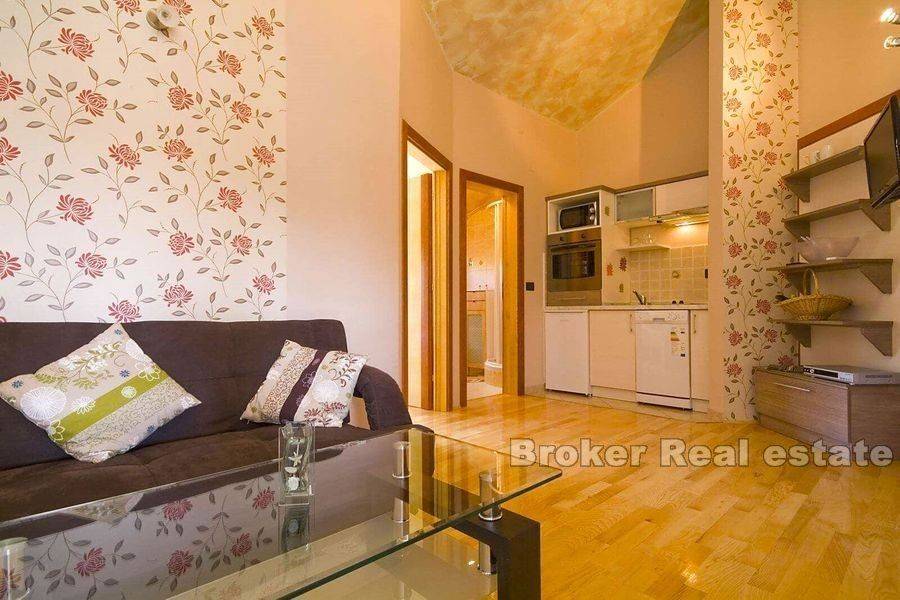 Excellently arranged and maintained mini property consisting of two separate residential properties located on a plot of 903m2. Central building with a total net living area of 405m2, currently entirely adapted for tourist rental. It consists of three floors: – Ground floor: 2 one bedroom apartments each of 24m2, and garage / storage – 1st floor: large owner’s four bedroom apartment of 116m2 – Attic: 2 one-bedroom apartments of 25m2, and 2 small studio apartments of 15m2. Ancillary building in nature indigenous stone house in its floor area of 65m2. It consists of two large bedrooms, each with a bathroom, and a living room that currently in nature has the role of a classic Dalmatian tavern. In front of this small stone building there is a charming terrace with indigenous plants and a swimming pool with a sun deck of all superb design and materials. Both properties are oriented to the south which provides them with sunlight and warmth throughout the year. This entire mini property is carefully maintained, fully decorated and equipped, although completely renovated 7 years ago, it leaves the impression of a new building. The macro and micro location is superb, quiet and very accessible from the distance of the first airport to the proximity of shops, clinics and restaurants, everything is at your fingertips within just 20 minutes. In front of the building is a beach that is literally private due to its configuration and accessibility.