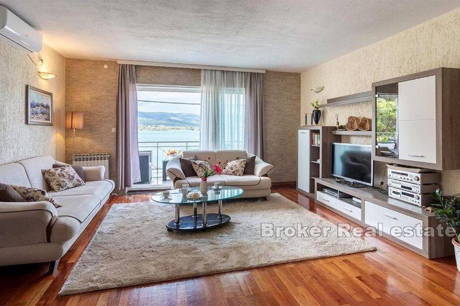 For sale is a stunning detached house located in the first row to the sea and just a short distance from the historic town of Trogir. This magnificent town was included in the world heritage list in 1997 as one of the best preserved Romanesque-Gothic cities in Central Europe. The house sits on a plot of 290 m2 and spans three floors, with a total living area of 200 m2. The ground floor features a studio apartment and a garage, while the upper two floors boast a fully equipped kitchen, dining room, living room, two bathrooms, and four bedrooms. The house also features several terraces with breathtaking views of the sea, perfect for socializing and enjoying the warm summer weather. The property includes a beautiful swimming pool and sunbathing area in the landscaped garden, with the added benefit of being just steps away from the beach. The house is ideal for both permanent residency and tourist rental, with a well-established rental history. There is a nearby supermarket, while the town center, with its restaurants, shops, markets, butchers, pizzerias, and coffee bars, is just 2 kilometers away. Split International Airport is just 3.5 kilometers away, making it convenient for travelers.