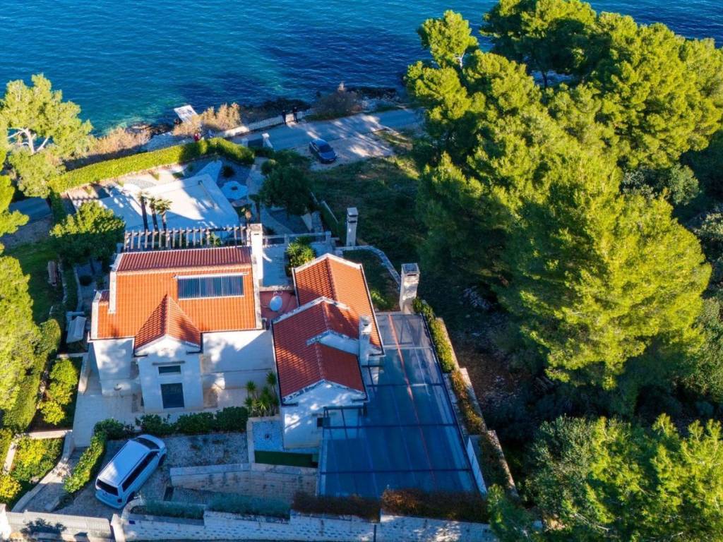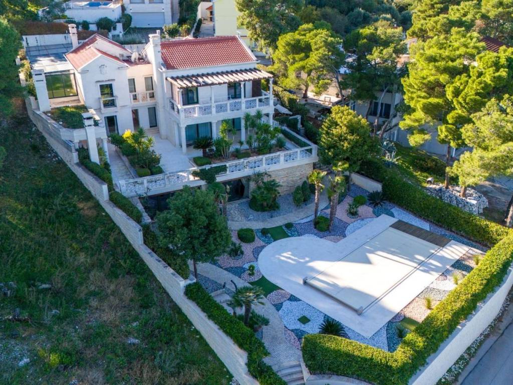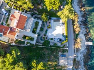 For sale is a beautiful stone villa with a total living area of 980 m2 on the island of Čiovo on a plot of land of 1370 m2. This special property is built of Brac stone and extends over a total of three floors. On the ground floor, there is a laundry room, a wine cellar and a wardrobe. Furthermore, on the ground floor there is a bedroom with a bathroom and a terrace, a kitchen with a dining room and a living room, as well as a spa area with a smaller indoor pool and a Russian sauna. On the second floor there is a bedroom with its own bathroom, a kitchen with a dining room and a living room, as well as a large terrace. On the third floor there is a spacious bedroom with its own bathroom, and two smaller rooms also with their own bathrooms. On the third floor there is a large terrace with a view of the sea. The property also has an apartment with a separate entrance, which consists of a bathroom, bedroom, kitchen and living room. The grounds of the villa consist of an outdoor heated pool and well-maintained Mediterranean plants. The offer of this beautiful villa includes central heating, solar panels, video surveillance and a water and air purification system. The property has 3 parking spaces and a garage for three cars is located on the ground floor of the house. It is only 10 meters from the sea and 8 km from the center of Trogir by air. Split Airport is 7 km away by air. It is a rarely seen luxury on the market that, in addition to a unique location, also offers a certain amount of glamorous property that can be enjoyed every day.