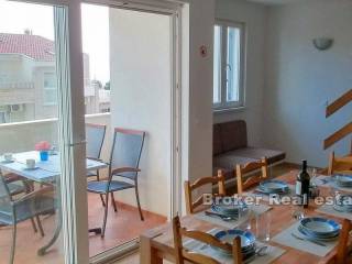 For sale is a furnished apartment on two floors, located in the town of Makarska. The apartment is placed on the second and third floor of an urban villa with a total of eight apartments, with its own outdoor parking space and one parking space in the garage. The apartment has three bedrooms, a separate entrance, balconies and bathrooms on both floors and an open concept living room with kitchen and dining area. The distance to the sea is approximately 630 meters by car or on foot. Half way to the beach is through a pine forest, and below the highway is a pedestrian walkway.