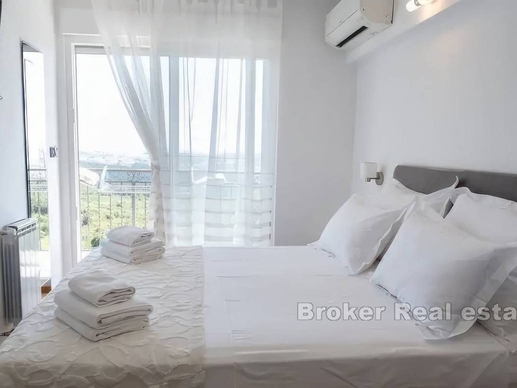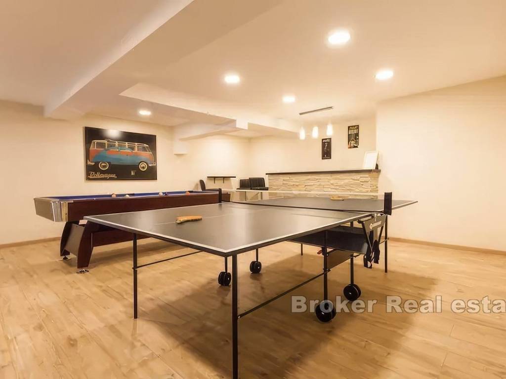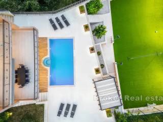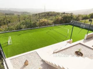 Villa with pool 10 kilometers from Split, with a beautiful panoramic view. The villa consists of three floors with a total living area of 335 m2, on a plot of 1150 m2. On the ground floor there is a spacious playroom with a bar, toilet and tavern with a fireplace and access to the pool. On the first floor are the kitchen, dining room, hallway, bathroom and living room with access to a terrace of 100 m2 with an open view of the natural environment, Kastela, Split and the sea. The second floor consists of four bedrooms, a bathroom, a living room and a large terrace on the south side. Around the house there is a maintained garden, swimming pool on the terrace with a pergola, and a field for sports activities, with grass and lights. The house also has parking for four cars. Present infrastructure: electricity, water and septic tank. The airport is 20 km away, and the distance to the nearest supermarket for basic needs is 500 m, to a larger store 1 km. Ten minutes drive to the highway. The quiet environment allows peace and privacy, and the city and all important facilities are only a short drive from the villa, which makes it ideal for tourist rentals and year-round living.