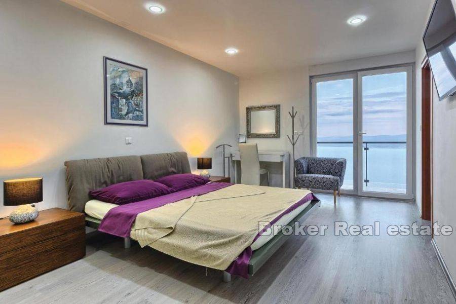 This modern villa is located on the slopes of a small hill with open and stunning sea views, a short drive from the most beautiful beach in the area. It is 7 km away from the small, Mediterranean town of Omis and the river Cetina and approx. 30 minutes drive from Split, a town under UNESCO protection, and 45 minutes from Split airport. It is oriented to the south, ie to the Adriatic Sea and islands. Due to the construction of the terrain, the villa was built in a cascade, on three floors, connected by internal and external stairs. The first, basement floor consists of a garage for two cars, a wellness area with air-conditioned fitness room and Finnish sauna and a home wine cellar. On the ground floor, second, level, there is a swimming pool of 26 m2 with a built-in massage system, outdoor shower and jacuzzi for up to six people. The pool is surrounded by a teak sundeck, outdoor dining area, sun loungers and parasols, and offers complete privacy and magnificent views of the sea and islands. In the inner part of the ground floor there is a fully equipped kitchen and dining room, a living room equipped with a fireplace and a bedroom with a private bathroom. On the last, third floor, there are three en suite bedrooms, with private bathrooms and access to the balcony, which, again, offers an open sea view.