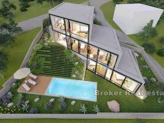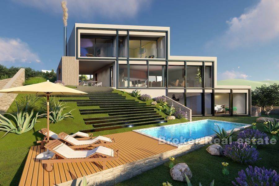 The luxury villa under construction in the Marina area. This superbly designed modern luxury holiday villa with 237 m2 of living space is located on a plot of 660 m2. It is spread over three floors connected by separate stairs. On the ground floor, there is a spacious living room, dining room, open kitchen, entertainment area, toilet, and exit to the covered terrace and garden. On the upper floor, there are two rooms with private bathrooms which offer a beautiful panoramic view of the entire bay. On the lower floor, there are two rooms with private bathrooms overlooking the pool and the nature surrounding the villa. All rooms are filled with natural light, thanks to the very large floor-to-ceiling glass walls that open up the interior to the beautiful sea view, respectively to the garden, sunbathing area, and swimming pool (which are conveniently placed for maximum privacy). In front of the house, there is a beautiful garden and swimming pool that offers complete privacy. The pool and sun deck provide complete privacy as they are below street level. Floor-to-ceiling glass doors on all levels allow natural light to fill all the rooms, while at the same time opening the space to the nature around and the beautiful sea view. Parking spaces are provided on the ground floor. The micro-location is close to the town center and all the facilities necessary for life. Macro-location is 25 minutes drive from Split airport, 20 minutes from Trogir, 45 minutes from Split. The house is currently in an roh bau state, which offers the potential buyer the opportunity to adapt the final interior design to the wishes of the new owners. Completion of construction is planned by the beginning of 2023.
