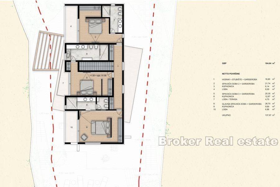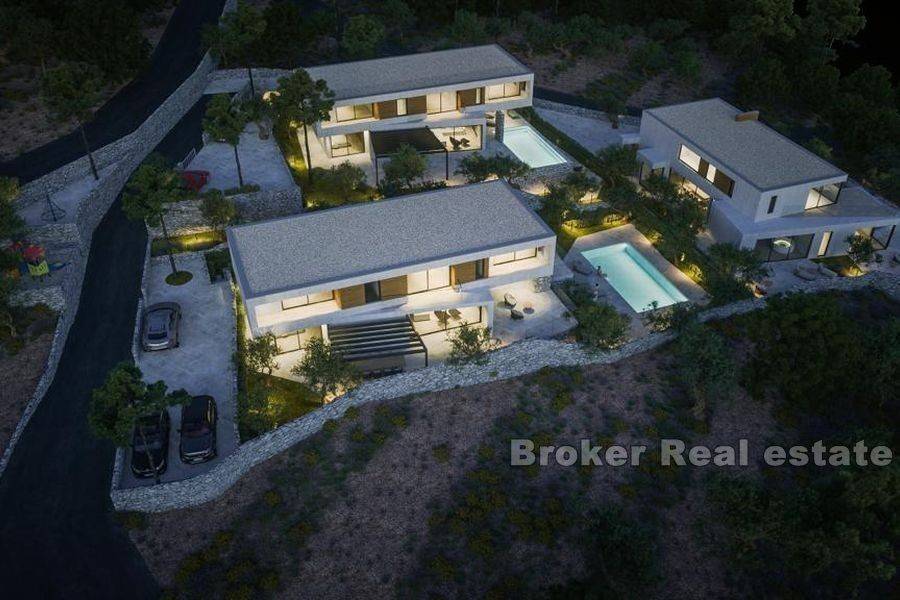 Modern villa located on elevated ground. The property is located in Vodice on a plot of land with a slight slope, which offers the villa an exceptional sea view. The villa with a living area of 391 m2 is located on a plot of 740 m2 and was built in a complex with two other villas that have a common access road but separate garages and entrances. The property consists of 3 floors, basement, ground floor and first floor. In the basement there is an engine room and laundry room, dressing room and storage room, as well as wellness and spa areas with jacuzzi, sauna and shower. On the ground floor there is a kitchen, dining room, living room, shared toilet and pantry and a bedroom with private bathroom and dressing room. All rooms on the ground floor have direct access to the terrace which is partly covered and has access to the summer kitchen and pool, while the bedroom has its own exit to the covered terrace. On the first floor there are three more bedrooms, each with its own bathroom and dressing room and access to a loggia or terrace. The construction of the villa used the highest quality materials with built-in smart systems throughout the property. The heating and cooling system in the villas will be provided with air conditioners and underfloor heating. Also, the price of the property includes 4 parking spaces in your own garage with a separate entrance separated from the other two villas. Due to its location and superb view that cannot be covered precisely because of the slope on which it is located, the property is ideal for tourism or for personal use throughout the year. The villas have complete security and privacy with plants that border the property on all sides. In addition to this property, there are two other villas that you can find under numbers 2043/27 and 2043/28.