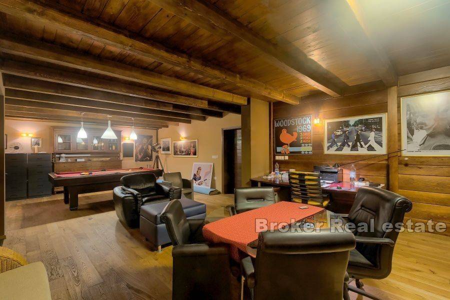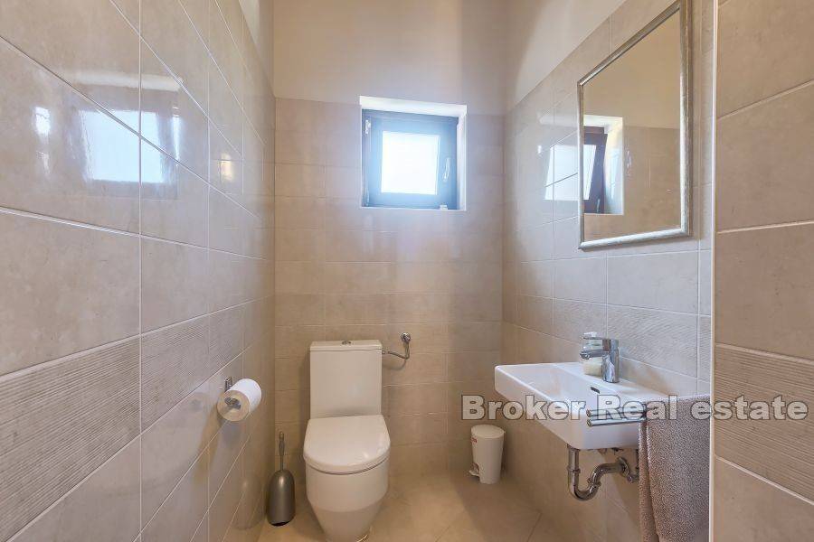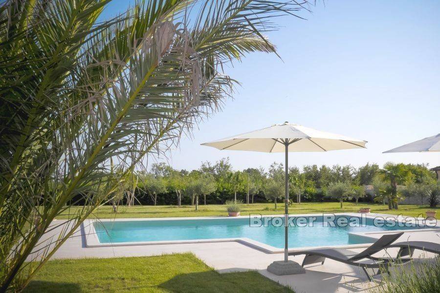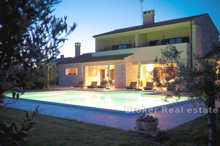 A modern villa located near Pula, 10 km from the sea and 18 km from the center of Pula. It was built in 2013. It is located on a total area of 1986m2, of which it is residential area 400m2. In the basement of the villa, there is a 64m2 social space and a storage room. It is located on the ground floor living room, kitchen, bedroom with bathroom and access to the terrace, open space with barbecue and summer kitchen, laundry room and toilet. The first floor consists of two bedrooms, of which each has its own bathroom and access to its own terrace. In the yard there is a 66m2 swimming pool, a terrace with a summer kitchen and an open garden. The property is surrounded by houses that are in the tourist business, and offers the possibility business or housing solution.