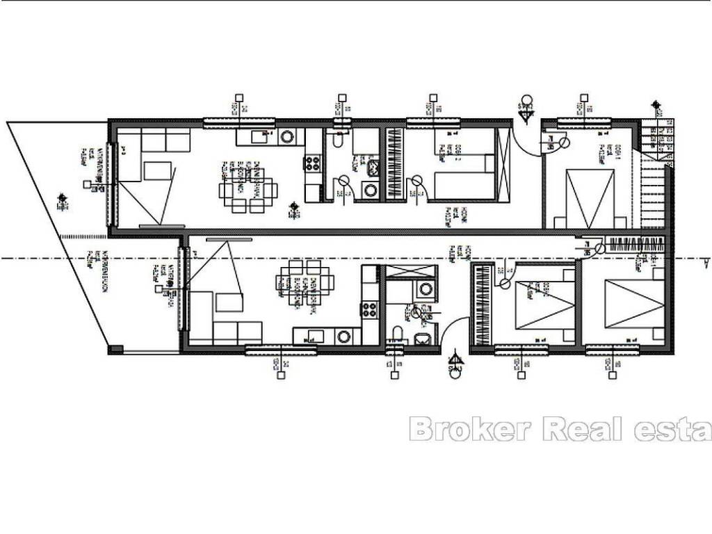 A luxurious apartment is for sale on the south side of the island of Čiovo, in the first row to the sea. It is in a great location, right next to the sea, with a beautiful view and direct access to the sea. The apartment is ideally south oriented and surrounded by Mediterranean plants and natural vegetation.   It is located in a smaller residential building with a total of four apartments and is located on the first floor. It has a total of 69,11 m² and consists of a hallway, two bedrooms, a bathroom and a kitchen with a dining room and a living room from which you can exit to a spacious covered balcony with an open view of the sea.   There is an outdoor parking space next to the building and top quality materials are used in the construction and furnishing (high class tiles and sanitary ware, air conditioner in every room, underfloor heating…).   All facilities needed for a pleasant and carefree vacation are located not far from the apartment. The property is an ideal choice for all those who are looking for an object in a prime location, in the first row to the sea.