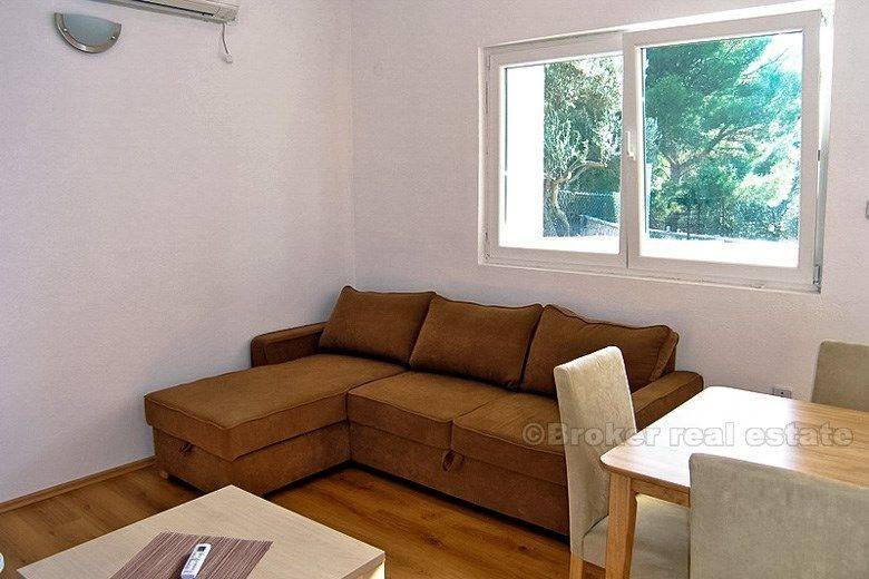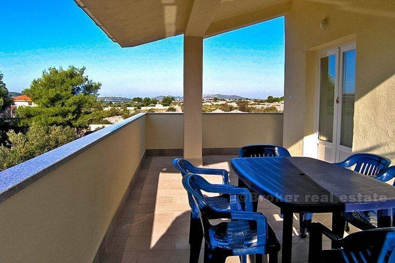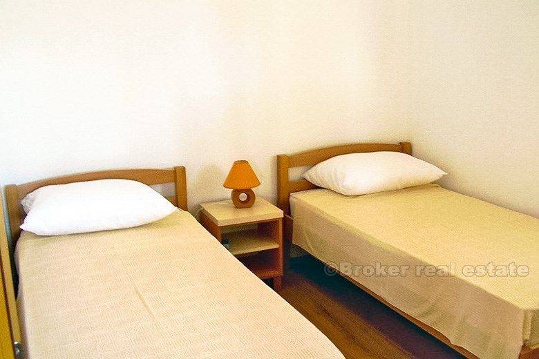 6-room house 90 m2 on 2 levels, nice and modern furnishings. Lower floor: living/dining room 22 m2 with satellite-TV, DVD and air-conditioning. Exit to the terrace. 1 room with 1 double bed (160 cm, length 200 cm). 1 room with 2 beds (90 cm, length 200 cm). Open kitchen (4 hotplates, dishwasher, micro wave, freezer). Shower/WC. Upper floor: (outdoor steps) living/dining room 22 m2 with satellite-TV and air-conditioning. Exit to the terrace. 1 room with 1 double bed (160 cm, length 200 cm). 1 room with 2 beds (90 cm, length 200 cm). Open kitchen (2 hotplates, micro wave). Shower/WC. 2 terraces 22 m2, covered, south facing position. Terrace furniture, deck chairs. Partial view of the sea. 9 km from Vodice: 2-family house, 2 storeys, built in 2006. 12 km from the centre of Sibenik, in a quiet, sunny position, 150 m from the sea, 150 m from the beach, in a cul-de-sac. Private: grounds 572 m2 (fenced), swimming pool round (5 m diameter, depth 120 cm, 12.05.-22.09.). Outside shower, barbecue. In the house: washing machine. Parking by the house in the grounds. Shop 1 km, pebble beach, shingle beach 150 m. Passenger boat connection from Jadrija to the historical town of Sibenik.