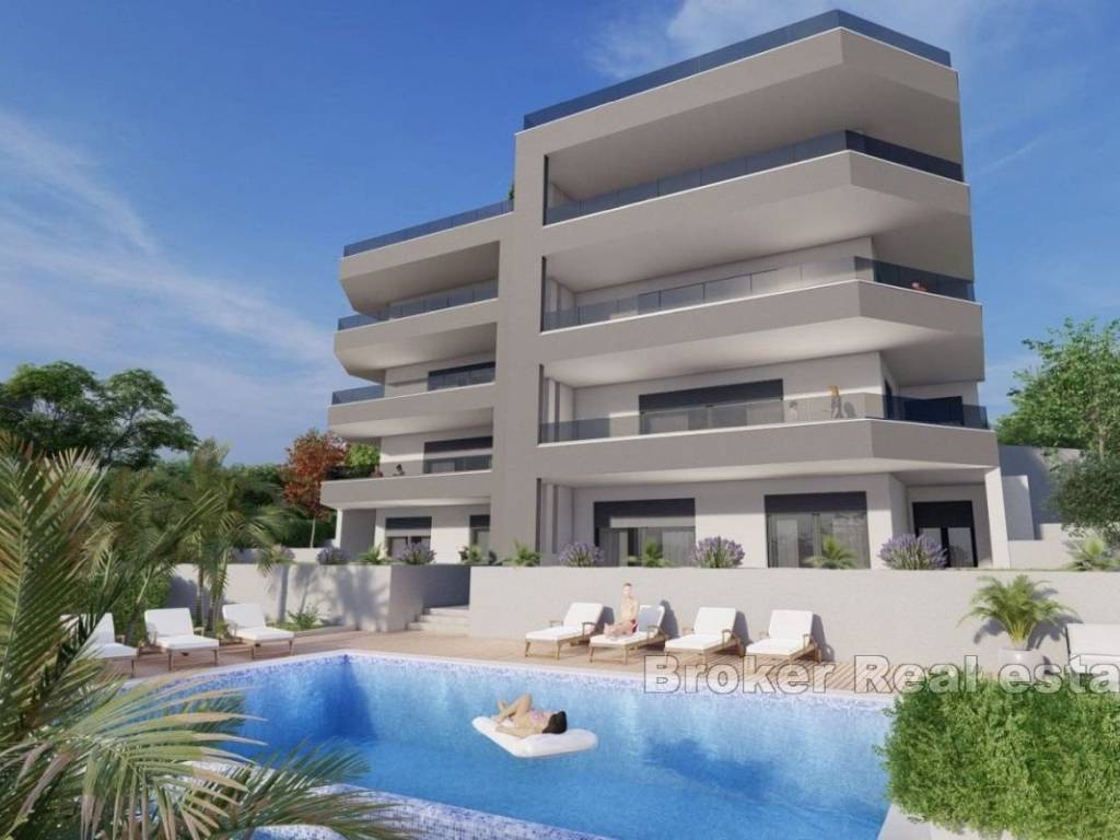 Modern apartments under construction, with pool and sea view, on sale, located on the northern side of the island of Čiovo, these modern apartments are situated in a peaceful residential area within a building featuring a total of 8 units. The apartments have a surface area of 111 m² and same floor plan, consist of a hallway, two bedrooms, two bathrooms, and an open-plan kitchen and living room with access to a spacious balcony. Residents of the building have access to a shared pool located in front of the property, and each apartment includes two parking spaces. The building is located on slightly elevated position which ensures exceptional views of the surroundings and the sea, which is only 240 meters away. Within walking distance, you’ll find plenty of amenities such as restaurants, bars, specialty shops, and numerous beautiful pebble beaches, ideal for families with children. These apartments are an excellent choice for a comfortable living experience or as an investment for a family vacation, offering maximum comfort and the unique quality of coastal living. Available apartments: • Ground floor (Apartment 4): €389,000 – SOLD! • 1st floor (Apartment 6): €409,000 • 2nd floor (Apartment 8): €429,000