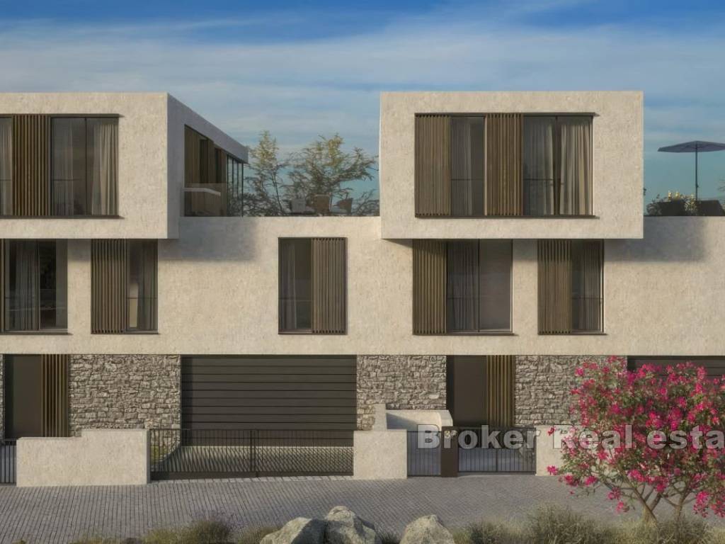 A modern semi-detached villa located on the south side of the resort in beautiful Savudrija, Istria, offers the ultimate experiance of modern living. The property area of 335,26m2 with an additional 26,60m2 of balcony and 49,80m2 of roof terrace. For comfort and ease of movement, an elevator is provided, further emphasizing the luxury of this property. The layout of the villa is designed to satisfy future owners. The basement, with a total area of 99,60m2 includes a spacious dining room, wine cellar, playroom, additional toilet and storage room. On the ground floor, measuring 84,76m2, there is an entrance hall leading to the living room, bathroom, additional storage room and garage with two parking spaces. The first floor of the villa, with a total area of 76,80m2, includes two bedrooms, each with its own bathroom and access to a 26,60m2 balcony, as well as a functional laundry room. The second floor, which extands over 74,10m2 presents an open concept with kitchen, dining room and living area, an additional toilet and another bedroom with a private bathroom. All rooms on the second floor have direct access to the 49,80m2 roof terrace. The villas in this modern resort are characterized by a modern design, while the choice of materials has significantly contributed to additional luxury of the property itself. All villas have flawless use of the resort’s services. For each villa, you can choose a decoration package, while VAT is not included in the price. There are also approximately three equal villas available: V34 – 335,26m2 + balcony 26,60m2 + terrace 49,80m2 – 1.677.645,00€ V36 – 335,26m2 + balcony 26,60m2 + terrace 49,80m2 – 1.425.450,00€ V38 – 335,26m2 + balcony 26,60m2 + terrace 49,80m2 – 1.425.450,00€