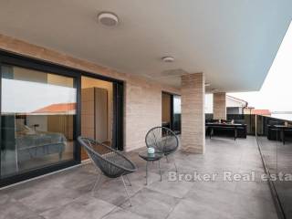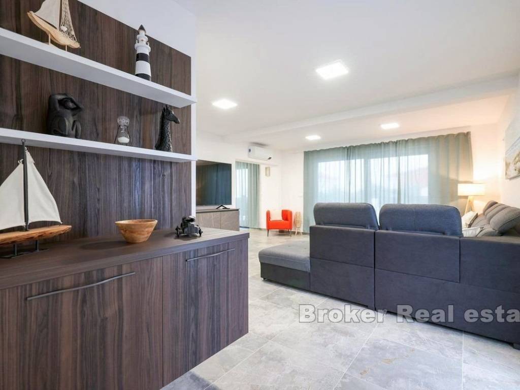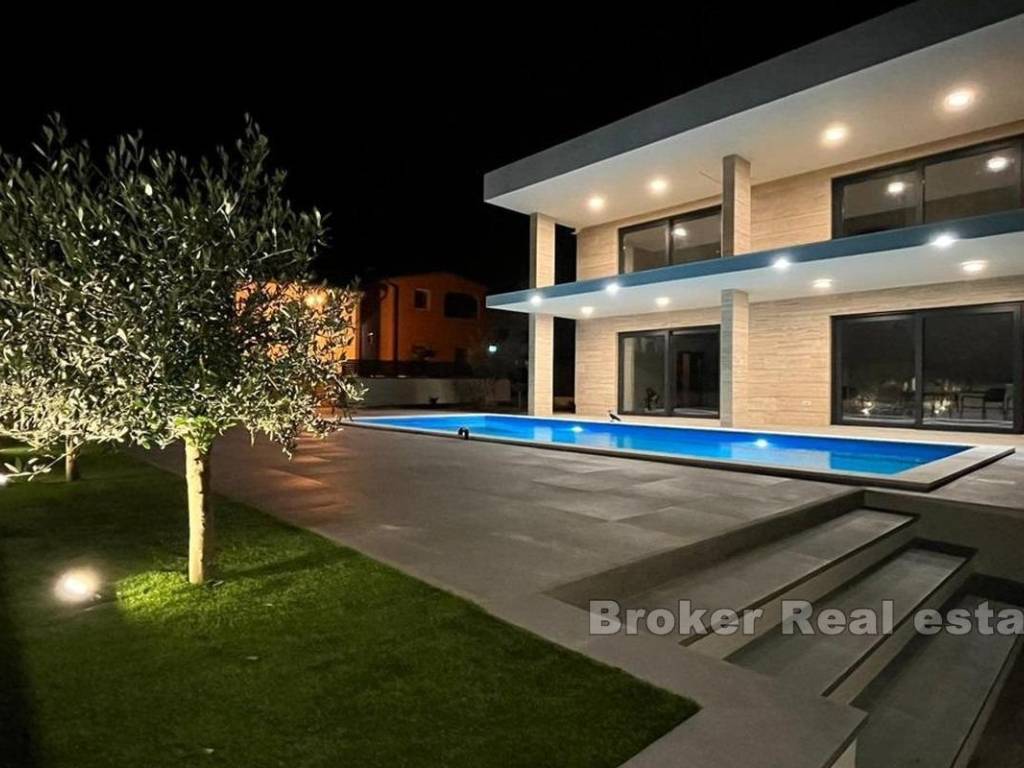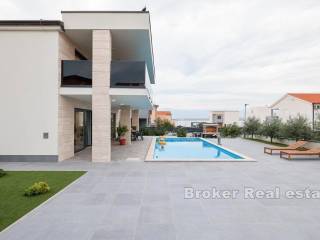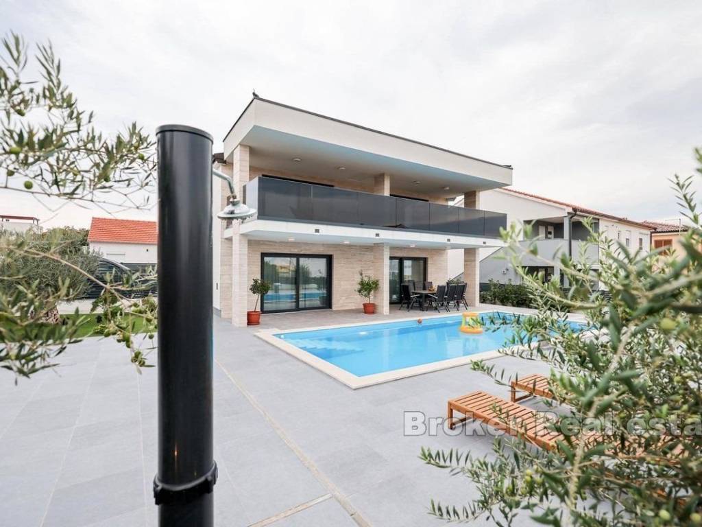 A beautiful house in a new building on the island of Vir. A new detached house with a modern design in a bay on Vir. The house with a living area of 220 m2 is located on a plot of land of 553 m2 in a smaller place, which therefore provides peace. The house is completely separated by a private fence, which ensures a great deal of privacy. The yard is extremely large and rich and is adorned with olive trees and greenery, as well as facilities such as a heated pool of 42 m2, an outdoor shower and a barbecue. The house extends over two floors. On the first floor there is a kitchen with a dining room, a living room, a bedroom and two bathrooms. The glass walls extend over the entire space of the ground floor, and each wall has the option of being completely opened, which gives the feeling of being open indoors. Internal stairs lead to the upper floor where there are four bedrooms and four bathrooms. The rooms have access to a beautiful common balcony that offers a view of the sea nearby. The entire lower floor is designed to be fully accessible to people with disabilities. Considering the modern design, the proximity to the sea and the direct access to the property, the house can be used for personal use or as a holiday home and as an excellent investment.