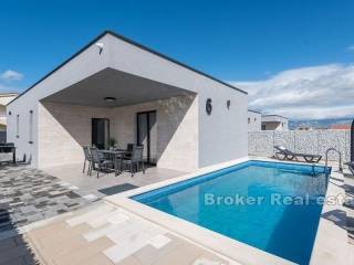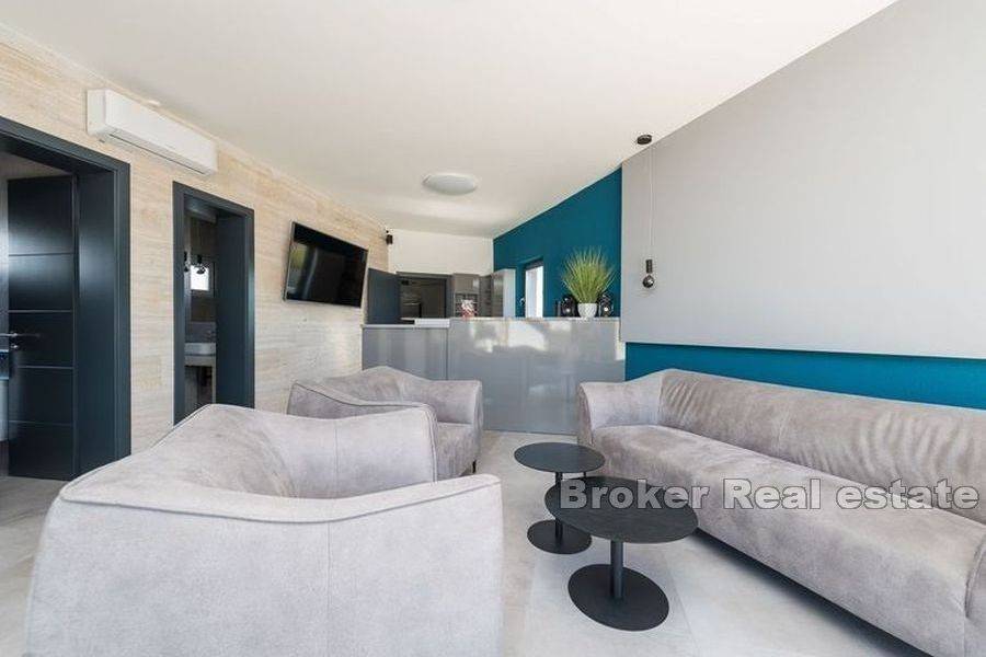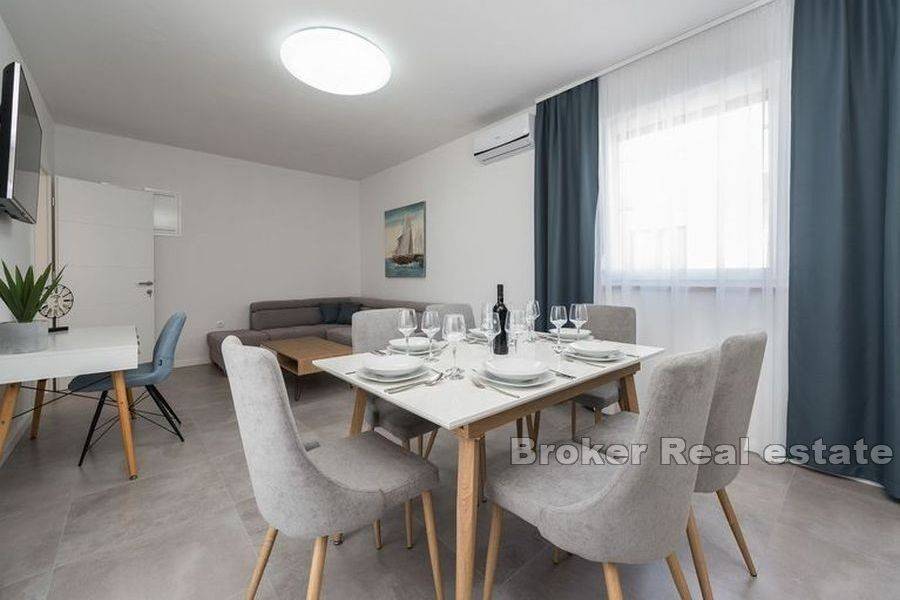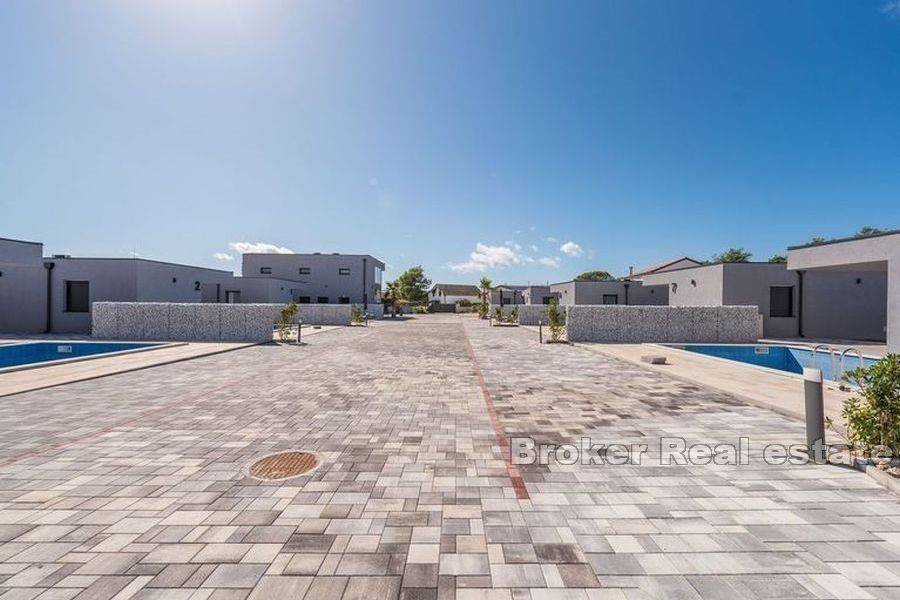An exceptional opportunity to join the growing tourist market on the attractive island of Vir. The resort with small villas, built on a spacious land of 3560 m2 in total, consists of nine villas, a central building and a playground. Located not far from the sea and beaches, offering an irresistible investment perspective for the future owner. An average of 350 m2 belongs to each of the houses, in front of which there is a swimming pool, parking and a landscaped garden with outdoor furniture. The interior of the ground floor apartment of approximately 107 m2 consists of a bathroom, two bedrooms with attached bathrooms, an equipped kitchen with a dining room and a living room. An air conditioner is used for heating and cooling, which is located in each room. The central building spans two floors and consists of a reception, laundry, fitness and spa rooms. The villas are categorized with 4 stars, for 4 people + 2, and the entire resort can accommodate a total of 54 people. The resort also has a court for basketball and indoor football, and it is decorated with planted palm trees, oleanders, pittospora bushes and impressive olive trees.