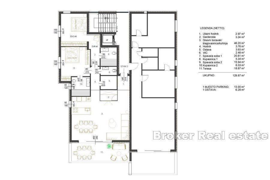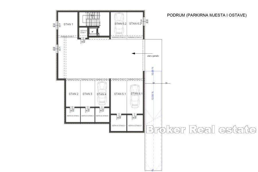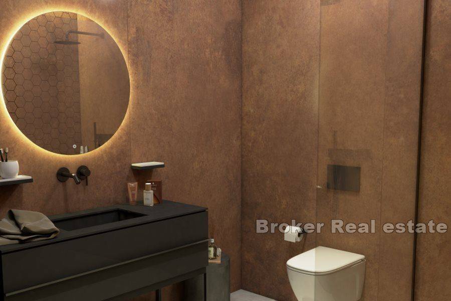Modern apartment located near the center of Rovinj, is located on the 1st floor of a newly built property consisting of six residential units. It consists of a hallway, a spacious living room with a kitchen and dining room and access to a covered terrace of 16.29 m2, two spacious bedrooms each with their own bathroom, an additional toilet, a storage room (area of the interior space 102.54 m2 + covered terrace 16.29 m2). The apartment has a garage of 13 m2 and a storage room of 6.40 m2. At a distance of 400 m from the sea and close to all necessary facilities for living.