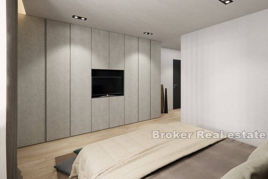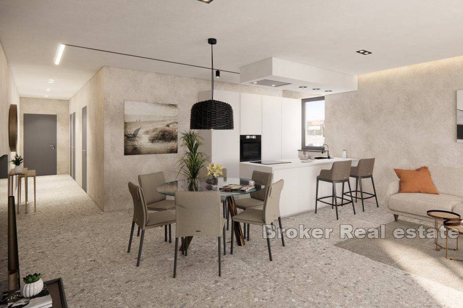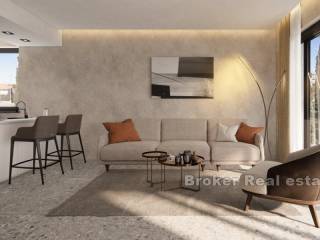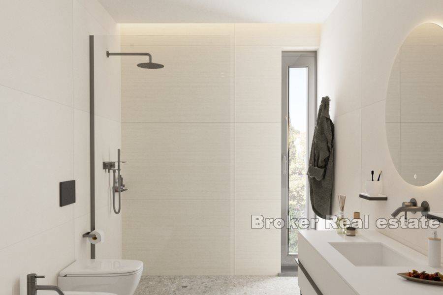 Modern penthouse with a roof terrace located on the last (third) floor of a newly built building with an elevator. It is located near the center of Rovinj and 400 m from the sea. It consists of a spacious and open living area with kitchen, dining room and living room of 39 m2 with access to a terrace of 16 m2. A storage room, a separate toilet, two bedrooms, one of which has a bathroom and a separate bathroom, are arranged in the corridor. The stairs lead to the attic, where there is a bedroom with a bathroom, a wellness room with a sauna and jacuzzi, and a 20.5 m2 terrace with a beautiful open view of the sea and the city. It has a storage room in the basement of 8.15 m2 and two parking spaces in the garage.
