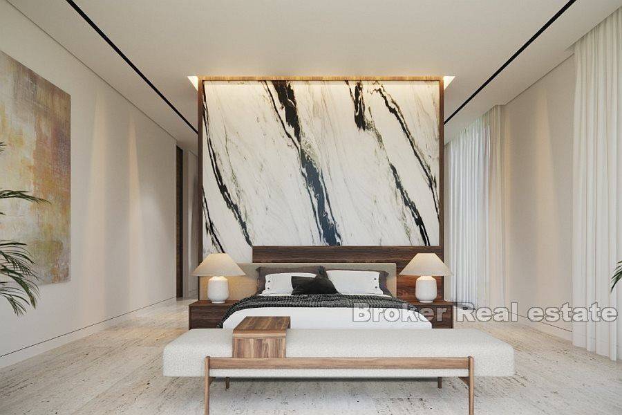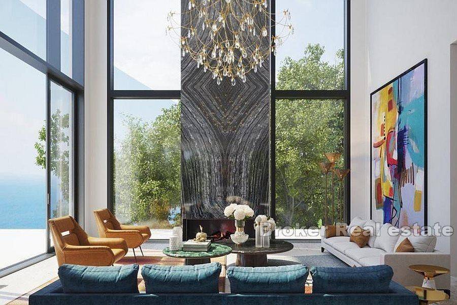 Building plot for sale with project of luxury villa, located in Veprinac. The land covers 1686m2 and includes two cascaded units. The living area of the planned villa is 640m2, with the first part reserved for the residential part and the second intended for rest and relaxation. The project includes five floors, two outdoor and one indoor swimming pool two elevators, two parking spaces, a beautiful garden on the lower parto f the plot, from where there is a wonderful view. On the first floor of the residential part there is a spacious living room with access to a terrace that offers a stunning view of the sea, a kitchen, a dining room, a dressing room, a toilet and an entrance hall. The second floor contains three elegant bedrooms, two bathrooms and a balconny accessible from one of the bedrooms. The third floor is reserved for two master bedrooms, each with its own balcony with a beautiful view and two spacious bathrooms. The second part of the villa is designed for enjoyment and is divided into two floors. On the lower ground floor there is a spacious terrace and two rooms for pool equipment. On the ground floor there is a wellness area with Finnish sauna, a toilet, a spacious sunbathing area and a swimming pool with a covered and uncovered parto f the infinty pool. On the first floor there is an additional spacious sunbathing area with a swimming pool. This property offers the perfect combination of privacy and tranquility, making it an ideal investment for tourist purposes or everyday living.
