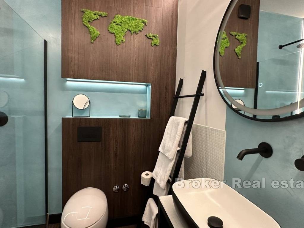 For sale is a newly built apartment villa consisting of seven apartments and one large two-bedroom apartment. The villa is located on a plot of 880 m² and spans three floors.   The ground floor includes a shared hallway and staircase, as well as five separate units: four apartments with kitchens and one room.   The first floor contains a two-bedroom apartment of 80 m² of living space, a studio apartment with a kitchen, and one more room.   An internal staircase leads to the roof terrace of 170 m², offering a stunning open sea view.   The entire villa is fenced, and the property features several outdoor parking spaces and a beautifully landscaped garden. Below the parking lot, there is also a basement with an area of 60 m2.   In front of the villa, there is a swimming pool with a sunbathing area and a children’s playground, making it perfect for relaxation and enjoying privacy.   It also stands out with its unique interior design, which further enhances the comfort of staying in the villa.   The villa is located in a very peaceful area, offering tranquility and seclusion, ensuring a pleasant stay. At the same time, its proximity to the beach and popular tourist destinations provides an excellent opportunity for tourism rental and investment.   This villa is ideal for those seeking a luxury property in an attractive location, with high rental income potential.