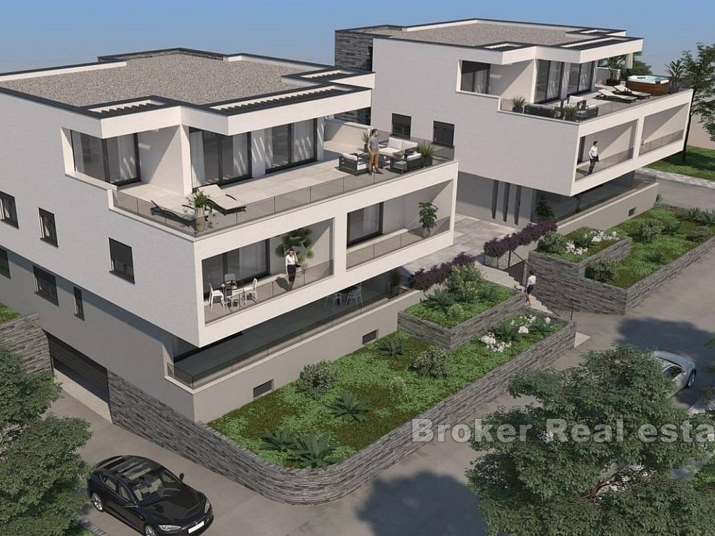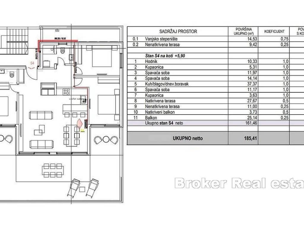 An exceptional three-bedroom penthouse in a new development situated in a peaceful and quiet setting. The entire development is conceived as a private, enclosed estate, offering tranquility and privacy in a prime location.   The building will consist of a basement with underground parking, a ground floor, and two upper floors with a variety of apartments.   Constructed with high-quality materials, the building will feature a reinforced concrete structure. The facade will be finished with stone wool insulation, and underfloor heating will be installed in the bathrooms.   Garage parking spots are available for purchase separately, allowing buyers to choose their own spaces. The project is currently in the phase of constructing the first floor, with completion expected by May 2025.   Penthouse S4 is located on the top floor and offers a spacious layout including a hallway, living room, kitchen with dining area, three bedrooms, two bathrooms, a balcony, and a large terrace.   The price includes two garage parking spaces, a storage room, and a northern balcony with a total area of 13 m².   Additionally, the terrace will feature a Jacuzzi, included in the price.   Overall, this penthouse provides a luxurious and comfortable living experience in a tranquil and pleasant environment.   The asking price for this property is €485,000.