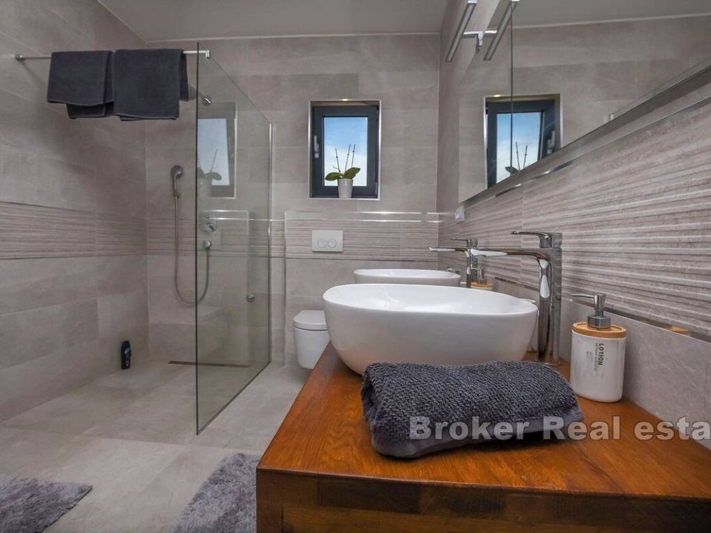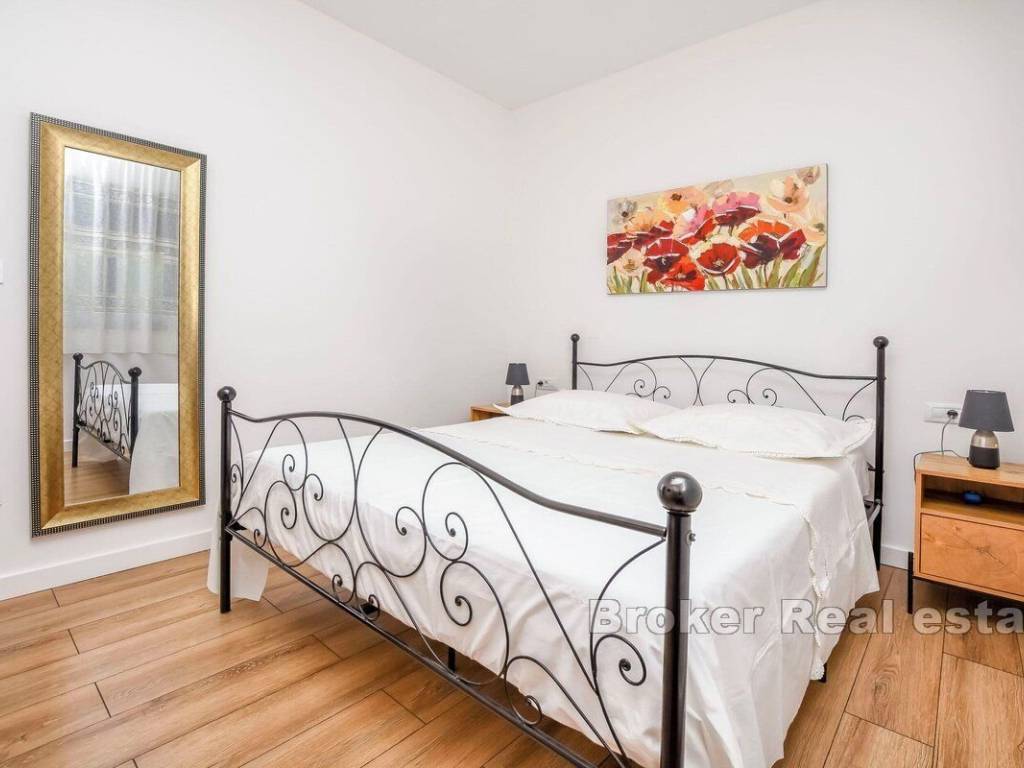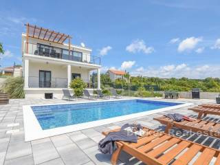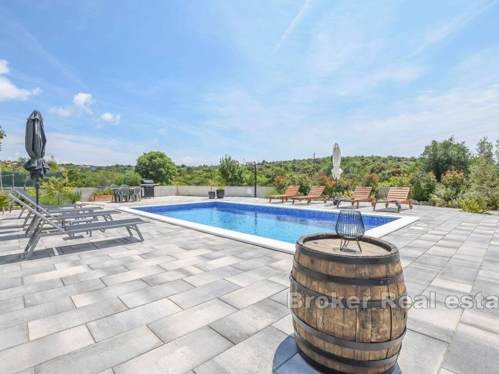 For sale is a furnished villa in a quiet location near Rogoznica. Built on a plot of land of 1033 m2 and a total living area of 124 m2. The villa extends over two floors. On the ground floor there are three bedrooms with access to the terrace, and a spacious bathroom. An internal staircase leads to the first floor where there is a bathroom, an open concept kitchen with dining area, and a living room with access to the terrace. On the spacious plot there is a swimming pool with a sundeck, a landscaped garden with a barbecue and parking for several vehicles. The villa is for tourist rental. Given the location, the villa is an ideal choice for those who want to enjoy the Mediterranean ambience and at the same time avoid crowds. Rogoznica is Rogoznica is a charming seaside town located on the central Adriatic, between Šibenik and Split. It is famous for its long coast, crystal clear sea and picturesque old town that stretches across the peninsula.