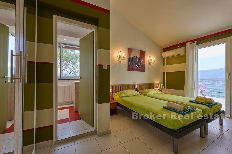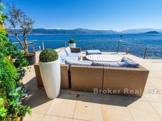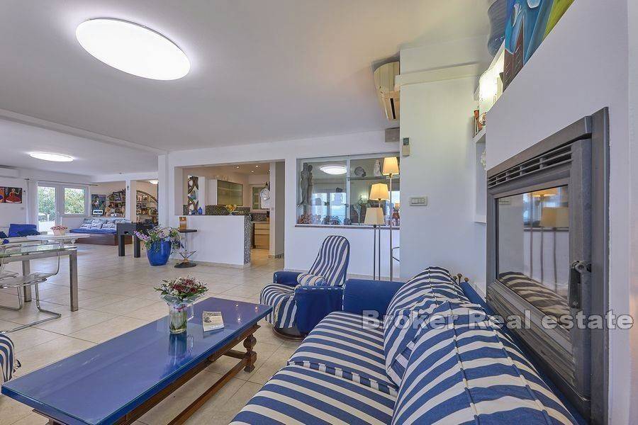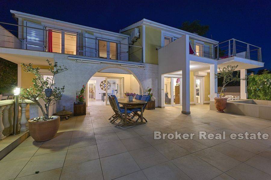 A charming villa ideally located in an attractive location by the sea, on the island of Ciovo, which is connected to the mainland by a bridge. In the immediate vicinity of the historic town of Trogir, included in the UNESCO list of world heritage sites.   The total living area of 300 m2 is built on a plot of 955 m2 and boasts an open view of the sea.   The villa extends over two elegant floors. On the ground floor there is an open space with two equipped kitchens, a dining room and a spacious living room. Bathrooms and bedrooms are arranged on the second floor, offering enough space to accommodate numerous guests.   The advantage of the property is the exceptional backyard, where there is an indispensable swimming pool with a sunbathing area and a terrace with a large number of corners for enjoyment and socializing.   Under the terrace there are additional rooms that can serve as apartments for guests.   storage room, engine room and garage with direct access to the beach. Considering the large backyard, the house offers a certain privacy and is an ideal solution for peaceful but urban living, as well as tourist rental.