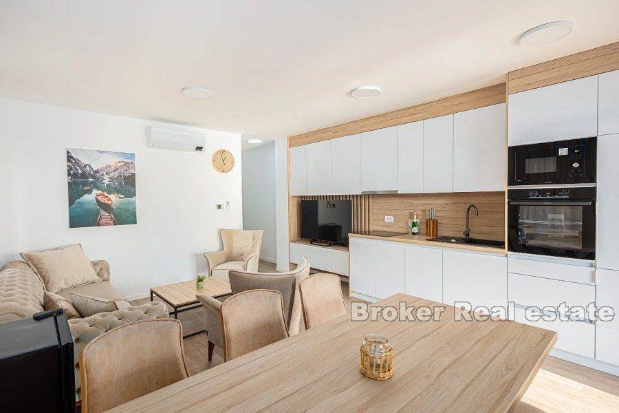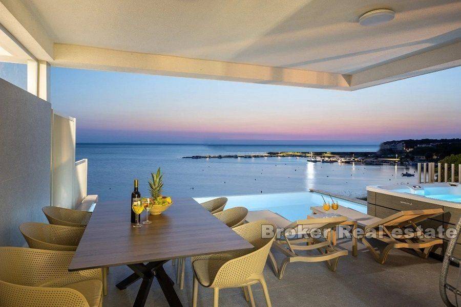 Luxury apartment first row to the sea with pool. The apartment is located on the ground floor of a new luxury building with 2 floors. It consists of a garden of 60 m2, two bedrooms, a modern bathroom and an additional toilet for guests, a spacious hallway, an equipped kitchen and dining room, a comfortable living room. From the living room there is a terrace with an enchanting view of the sea, on the terrace there is a jacuzzi and a pool for relaxation, in addition to a place for sitting and family gatherings. The apartment is fully equipped and furnished. It exudes elegance and quality. The highest quality materials were used in the construction. It has underfloor heating and air conditioning connected to a hydrobox (heating, PTV and air conditioning on the same heat pump system-Samsung) Excellent property by the sea and the beach. Parking place included in the price. The apartment is included in the VAT system, the buyer does not pay real estate sales tax.