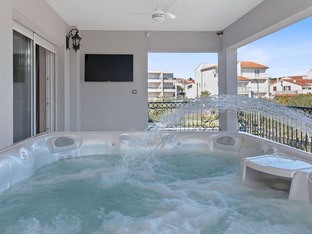 A modern villa with an area of 530 m2 is located in the vicinity of Sibenik on a spacious plot of land of 1000 m2. The combination of modern and traditional perfectly fit into the location of the property and created an uncompromising concept of the property. The highest quality materials such as real stone and hand-carved wood were used for interior and exterior decoration. The outdoor tables are stone, as well as the interior surfaces and surfaces such as the bathroom sink, stairs, tables, kitchen island, etc. The villa has a private entrance and is located in a cul-de-sac, so there is no interference from neighboring properties. In addition to the use of rich materials, the renowned designer of the villa also took care of the security system, which is provided by video surveillance and an alarm. The grounds of the villa consist of an outdoor covered and non-covered parking lot, a swimming pool, a sun deck, a garden, a covered terrace and a summer kitchen with a covered dining room. The unusual entrance to the villa leaves you breathless at first sight because it offers a view of the rich stairs and glass walls along the entire living room and kitchen. The property extends over two floors. On the ground floor there is a garage, a storage room and a laundry room, two bedrooms with their own bathroom and a Finnish sauna, a living room, a kitchen and a dining room. All rooms on the lower floor offer access to the outdoor terrace. An internal staircase leads to the upper floor, which consists of three bedrooms, each with its own bathroom and access to its own balcony. In the center of the upper floor, there is also a pool table for players and an exit to the covered outdoor balcony with a jacuzzi. The entire villa is equipped with an electric smart system for lowering and raising blinds. This property is truly an example of a luxury home on the banks of the Lipa naša. The advantage of the villa is that it offers peace and privacy directly on the sea, and at the same time it is located in a picturesque tourist town full of history. It is only 80 meters from the first beach and 64 kilometers from the nearest airport.