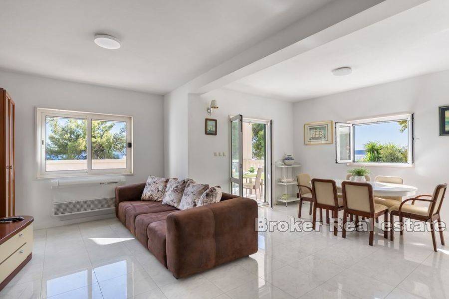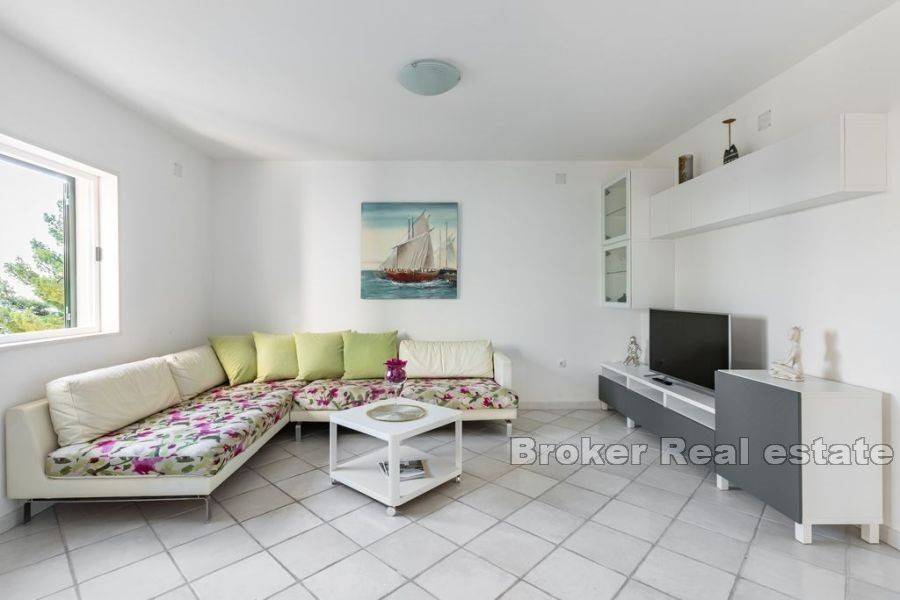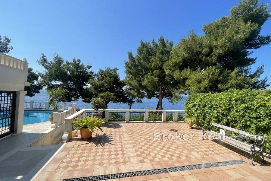 A unique villa located on the southern side of the island of Čiovo, in an extraordinary location in the first row to the sea. It is a rare property on the market considering the location, land area and cascading layout. It is surrounded by pine trees, is located in a quiet microlocation and has a southern orientation. There is a house with a surface area of 550 m² spread over three floors on a spacious plot of land. On the first floor, there are three bedrooms, two bathrooms, a toilet and a kitchen with a living room from which there is a spacious terrace. On the second and third floors there are two two-story apartments with three bedrooms each, bathroom, toilet and kitchen with dining room and living room. The facility is decorated with numerous terraces surrounded by pine trees with an open view of the sea. The entire facility is air-conditioned and has a garage with two parking spaces. It is equipped with a swimming pool, jacuzzi and numerous terraces and gardens with Dalmatian horticulture. Right in front of the building there is an untouched beach, and all other necessary facilities such as restaurants, cafes, shops and the town center are located within walking distance, while the airport is only 10 km away. An ideal investment due to the possibility of generating income from tourist rentals.