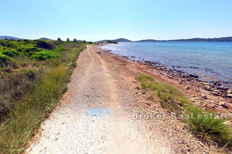 Land first row to the sea zone R1 in Vodice. The land is located in an attractive location 10 m from a beautiful pebble beach. The total area of the land is 2,727 m2 and is in the shape of the letter T. The land is located within the unfinished part of the settlement (new construction), in the area intended for development and landscaping outside the settlement – in zone R1 – sports and recreation zone – ŠPORT. The construction of accompanying facilities (outdoor swimming pools, catering, shops, sanitary facilities, showers, cabins, etc.) is permitted. uncovered playgrounds (basketball, mini-football, etc.), storage for sports and recreational equipment with sanitary facilities, temporary assembly-dismantling structures and canopies, and children’s playgrounds. When building new buildings, it is necessary to comply of the following conditions: – the minimum area of the parcel is 1000 m2 – the maximum allowed coefficient of construction is kig=0.05 – the maximum allowable utilization coefficient is kis=0.05 – the largest floor plan projection of an individual building can be a maximum of 50 m2 – terraces, canopies, awnings, swimming pools up to 100 m2, parking lots, and playgrounds without auditoriums are not included in the area budget from the previous indent – the maximum number of storeys is one storey, up to a maximum height of 4.0 m from the lowest elevation of the finally landscaped terrain at the lowest point next to the building to the crown of the roof – roofs can be flat or slanted, inclined between 17º and 23º, covered with Mediterranean tiles or a pile of gutters – the plot must have access to a traffic area of min. 3 m wide, including the coastal promenade. The price of the land is 300 e/m2.