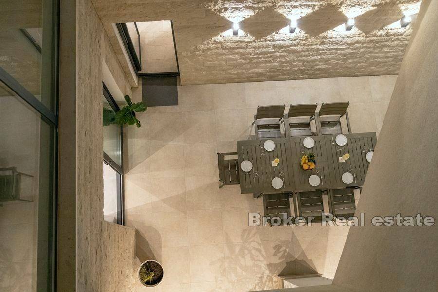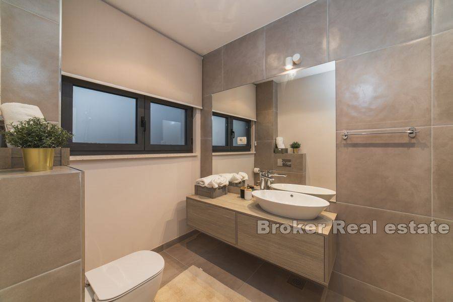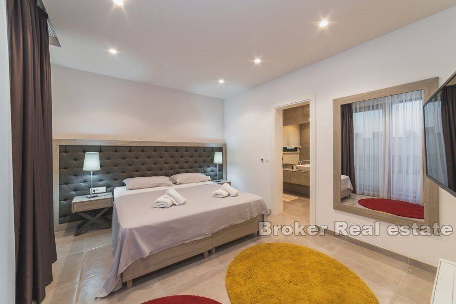 For sale is a luxurious villa of contemporary architecture with a swimming pool in Trogir, on the island of Čiovo, with a view of the sea. It is south oriented and its 510 m² of living space is distributed over a total of four floors on a plot of 600 m². In the basement there are amenities such as gym, jacuzzi and sauna, as well as bathroom. On the ground floor there is one bedroom with a bathroom and a kitchen, a comfortable living room with access to a spacious terrace and a guest toilet. On the first and second floor there are 6 more bedrooms with their own bathrooms and several balconies that have been carefully designed so that each room has access to one of them. On the terrace there is a 35 m² big swimming pool with sun deck and a summer kitchen with barbecue. The villa has a garage and is fully air conditioned and equipped with solar panels that provide hot water. The villa is ideal for investors in tourism and considering the attractiveness of the location and the proximity of facilities, it is also an excellent choice for urban living.