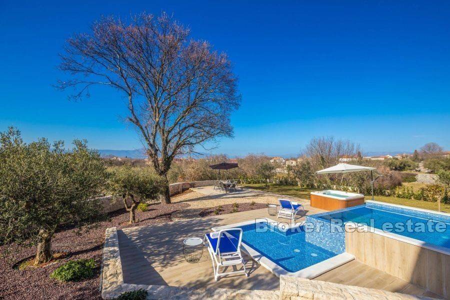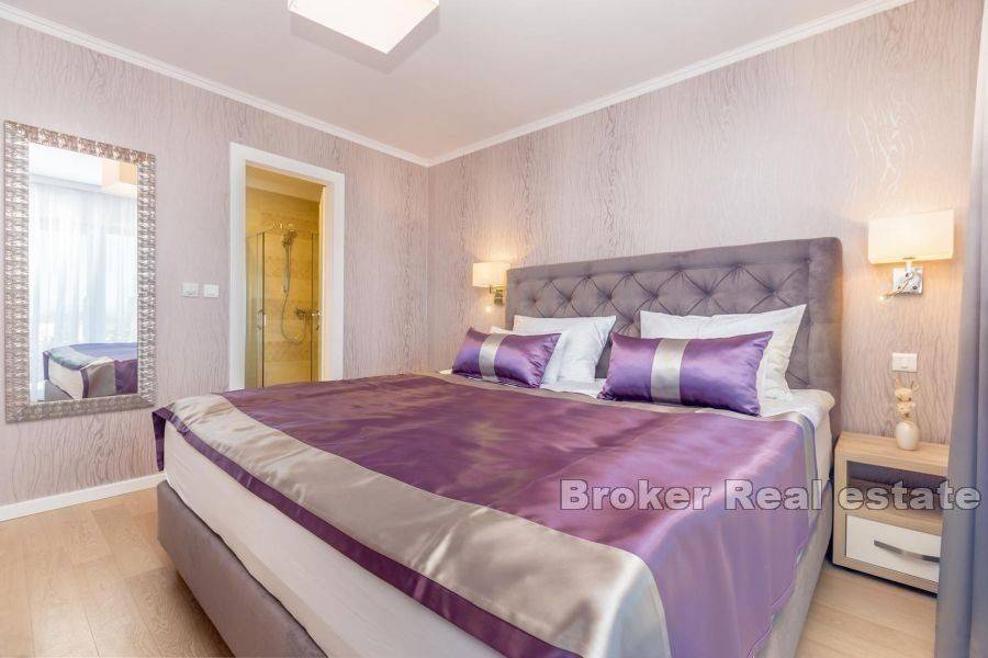 Detached house for sale on Krk, not far from Malinska. Total living area 281 m2, located on a plot of 1289 m2. The house is spread over a total of three floors. In the basement there is a bathroom and engine room, as well as two spacious rooms that offer the possibility of being decorated as a tavern with a fireplace and a space for recreation. The ground floor consists of an entrance hall, a kitchen with a dining room, a bedroom, a toilet, a bathroom and a large living room through which there is a direct exit to a beautifully decorated terrace. Upstairs there are three bedrooms, two bathrooms and two balconies with a panoramic view of the sea. In the beautifully landscaped garden there is a heated swimming pool with a sunbathing area, a jacuzzi and a space for relaxing and socializing with loved ones. During construction, only the highest quality materials were used, the house is equipped with air conditioners, underfloor heating in the bathrooms, PVC joinery with aluminum shutters. The house is sold fully furnished and superbly equipped. With its large garden, it ensures privacy and peace in a beautiful location on the edge of a green area with an idyllic view of the sea.