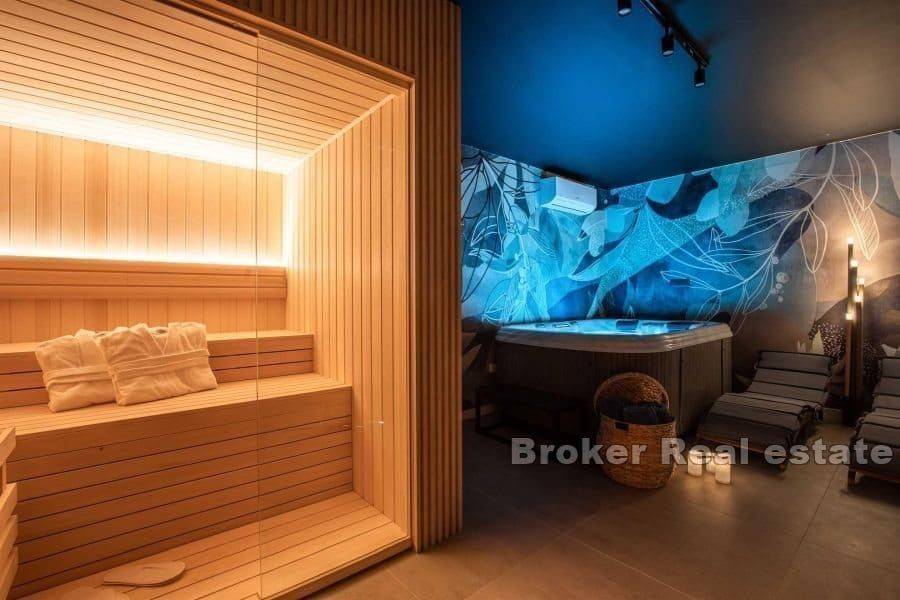 A modern apartment with a total living area of 134 m2 is for sale. The apartment extends over two floors. The ground floor consists of a bedroom with a bathroom, a wellness room with a sauna and jacuzzi, a bathroom and a storage room. From the ground floor there is an exit to the covered terrace, which is connected to a beautifully landscaped garden with its own pool. The combination of indoor and outdoor space, with a swimming pool and sea view, gives additional appeal. The first floor reveals an open-concept living space that unites the living room, dining room and modern kitchen, two bedrooms and a bathroom. The spacious balcony offers a wide view of the sea. The apartment is equipped with top-quality equipment and furniture and is sold as such together with two parking spaces. This exceptional property is ready to meet the highest standards of luxury living or serve as a lucrative investment opportunity within the growing tourist market of Krk.