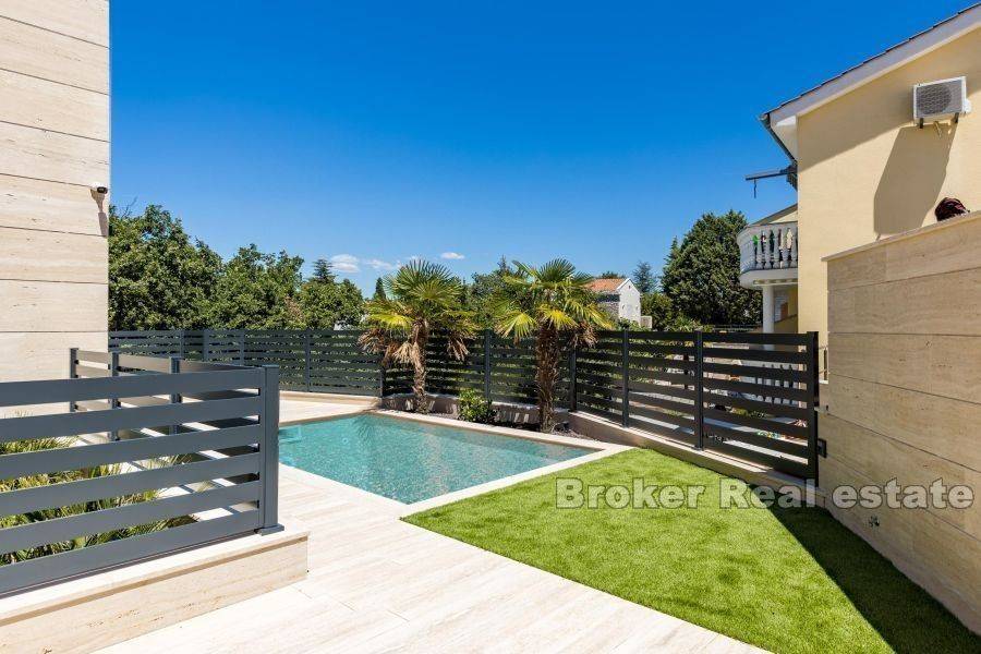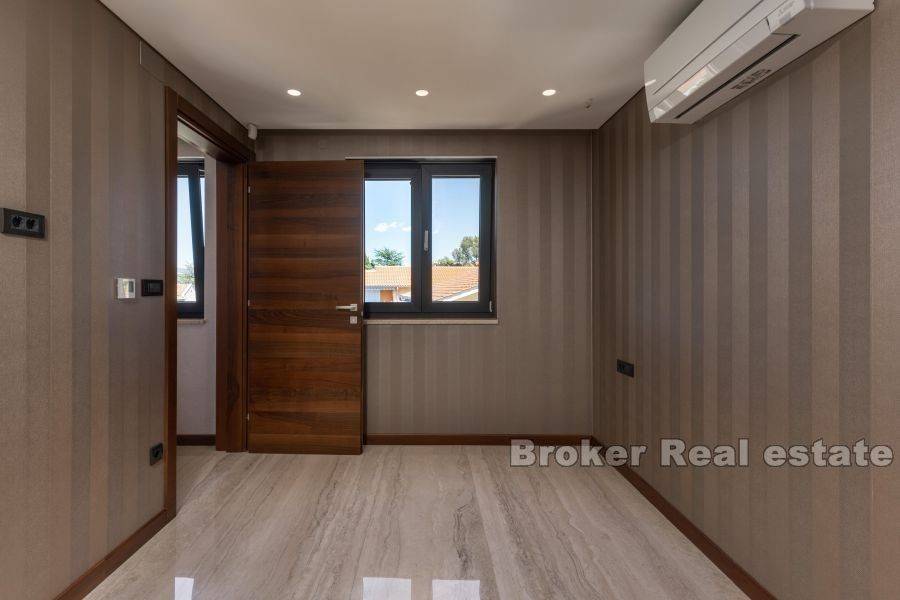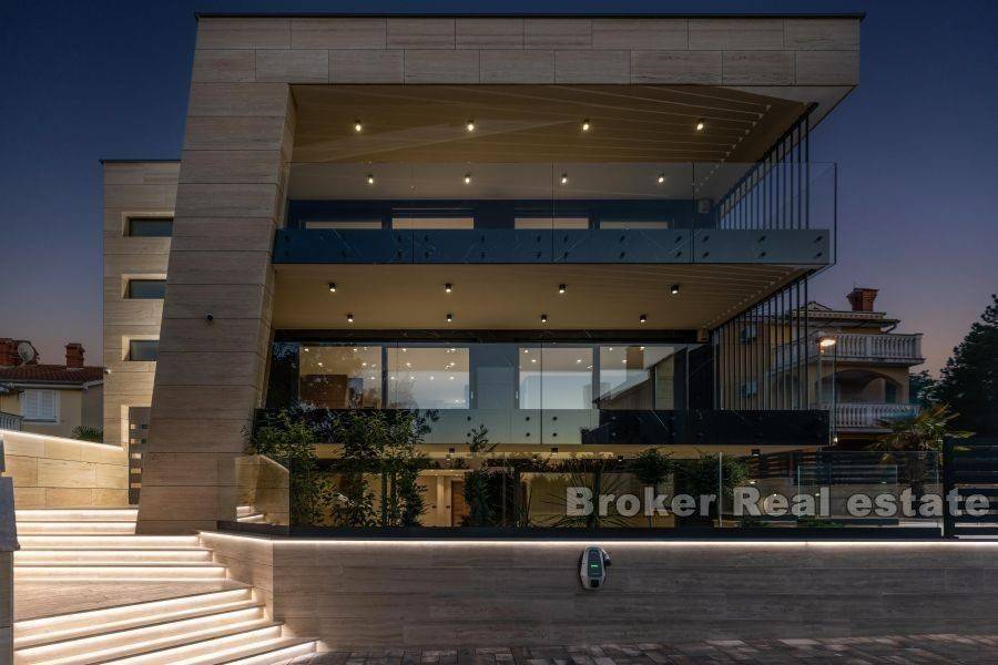 A new property for sale in an attractive location only 150 m from the sea. The luxury penthouse is located on the second floor of an apartment villa with a total of three residential units. It consists of a total living area of 119.45 m2 and has a hallway, living room, kitchen and dining room, three bedrooms, two bathrooms, a toilet and a large covered terrace with a beautiful panoramic view of the sea. During the construction of this luxury villa, only the highest quality materials and equipment were used. Some of the equipment is aluminum carpentry, a stone facade, a glass fence combined with natural stone, and high-quality bathroom furniture and sanitary ware. Great attention was paid to every detail during the decoration of this luxury apartment. The Penthouse also has a beautifully landscaped garden with a swimming pool and sunbathing area. A unique property in a great location is a perfect opportunity for family life or vacation.