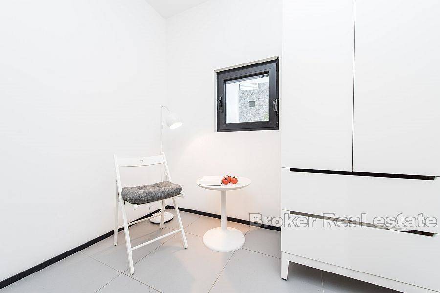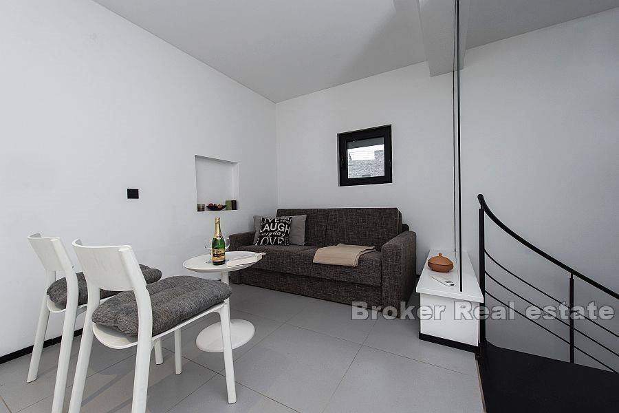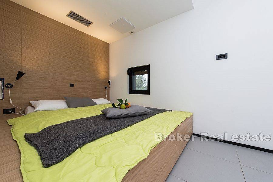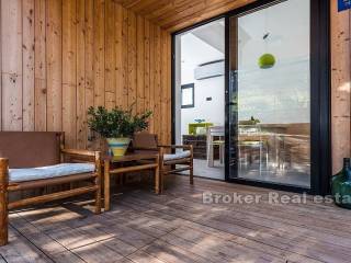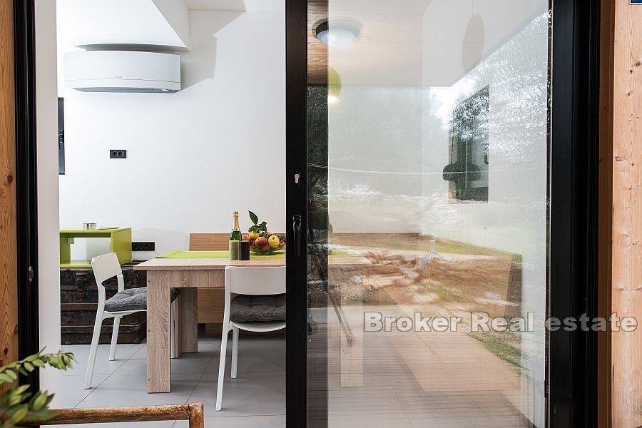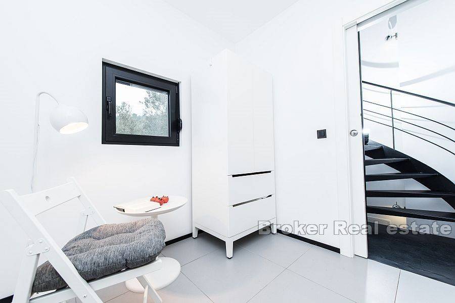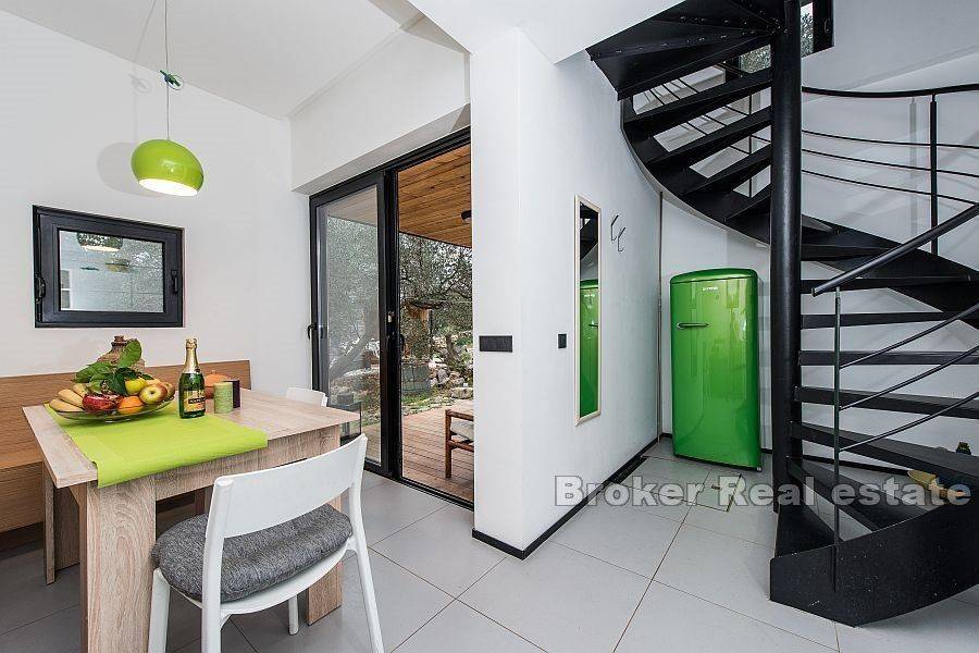 Detached house with sea view with a total living area of 80 m2, located in a small village in the northeast of Dugi otok. It consists of three floors – ground floor, first and second floor. On the ground floor there is a kitchen with a dining room which leads to a landscaped and covered terrace. On the second floor there is a living room and a bathroom, while on the last floor there is one bedroom with a bathroom. On the top floor there is a terrace of 21 m2 with a jacuzzi that offers beautiful view of the bay, sea and islands. The garden is decorated and cultivated with Mediterranean plants. Possibility of parking space for one car.