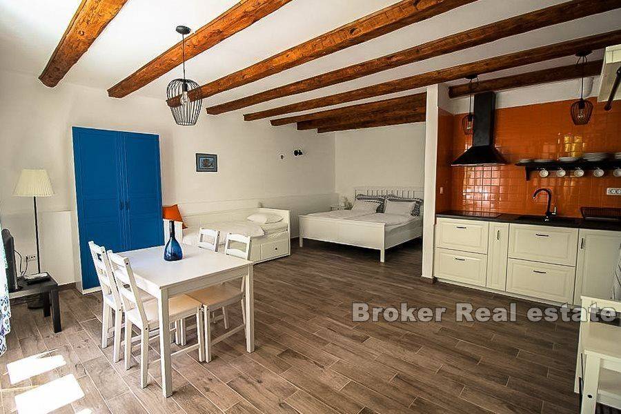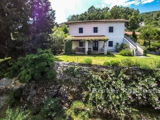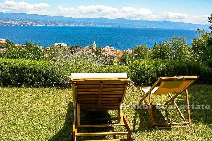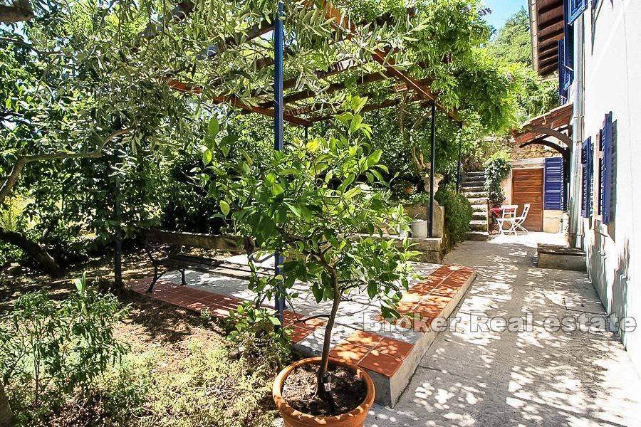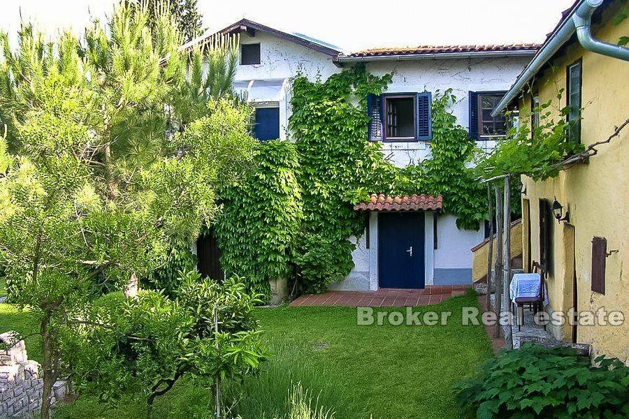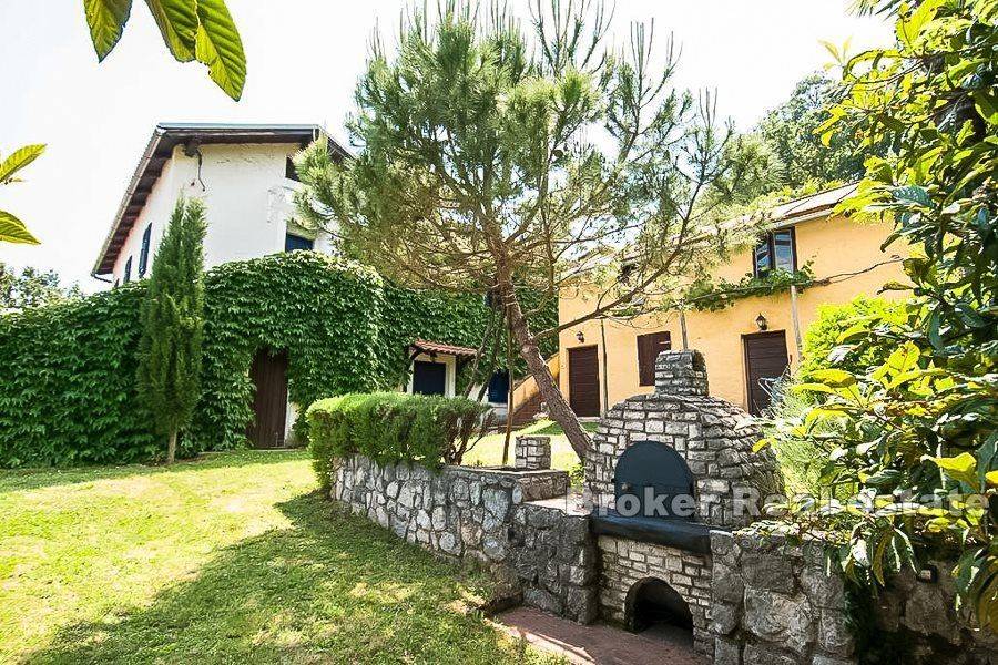A picturesque property located in a quiet Istrian village near Opatija. It consists of a detached two-storey house with a living area of 200 m2 together with a land of 8144 m2. On the first floor there are two studio apartments with bathroom. Each consists of a room with four beds, kitchen, dining table with chairs, and a separate bathroom. Also, there is another separate bedroom with a bathroom on the floor. The second floor consists of two studio apartments. The first apartment has the layout as described on the first floor, while the second apartment has two bathrooms. The house is fully furnished and maintained. It is decorated in a slightly rustic style, combining interesting colorful details, charming woodwork and stone motifs. It exudes a peaceful and relaxing atmosphere. All studio apartments have air conditioning. The land area of 8144 m2 includes a spacious garden with landscaped vineyards and Mediterranean vegetation, which offers a beautiful view of the sea, located at a distance of 500 meters. It has two covered terraces decorated with wooden billets , flowers and garden benches. The whole experience of the property is completed by a well and a barn on two floors. The first is a tavern, while the second serves as a storage room for tools and machines for maintaining the property. The property has parking spaces. Built in the early 20th century, it has been renovated several times since the 1990s and connected to the city water supply and sewerage system.