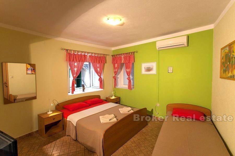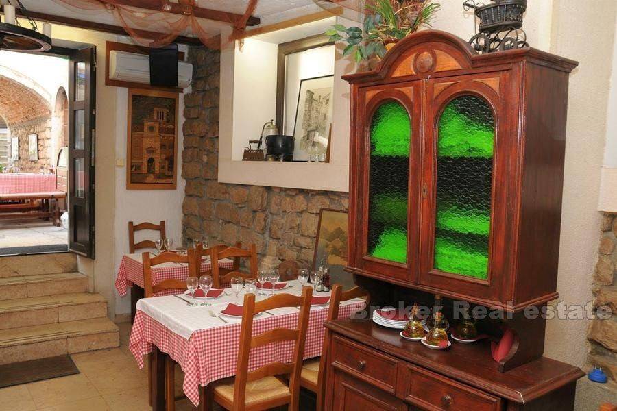 On the island of Cres, in the old part of the town is the house completely renovated in 2003 year. It consists of 4 floors: ground floor, two floors and attic, with closed staircase. On the ground floor there is a restaurant serving a terrace of 50 m2, with a total of 100 seats inside and outside. On the first floor there are three double rooms and one studio apartment. On the second floor are two studio apartments and the lower floor of a two-storey apartment. In the attic is the upper floor of a two-storey apartment. This apartment consists of living room with kitchen and dining room, storage room, laundry room and terrace, and on the ground floor there are two bedrooms, bathroom and wardrobe. Three bedrooms and three studios are rented for tourist purposes. All rooms have their own bathroom, are air-conditioned, with good quality external joinery, new roof tops and refurbished street facade. At a distance of 100 meters it is owned a parking lot for a total of 7 cars. The property is ideal for staying and continuing to do business with tourist rentals and catering (with regard to restaurant).