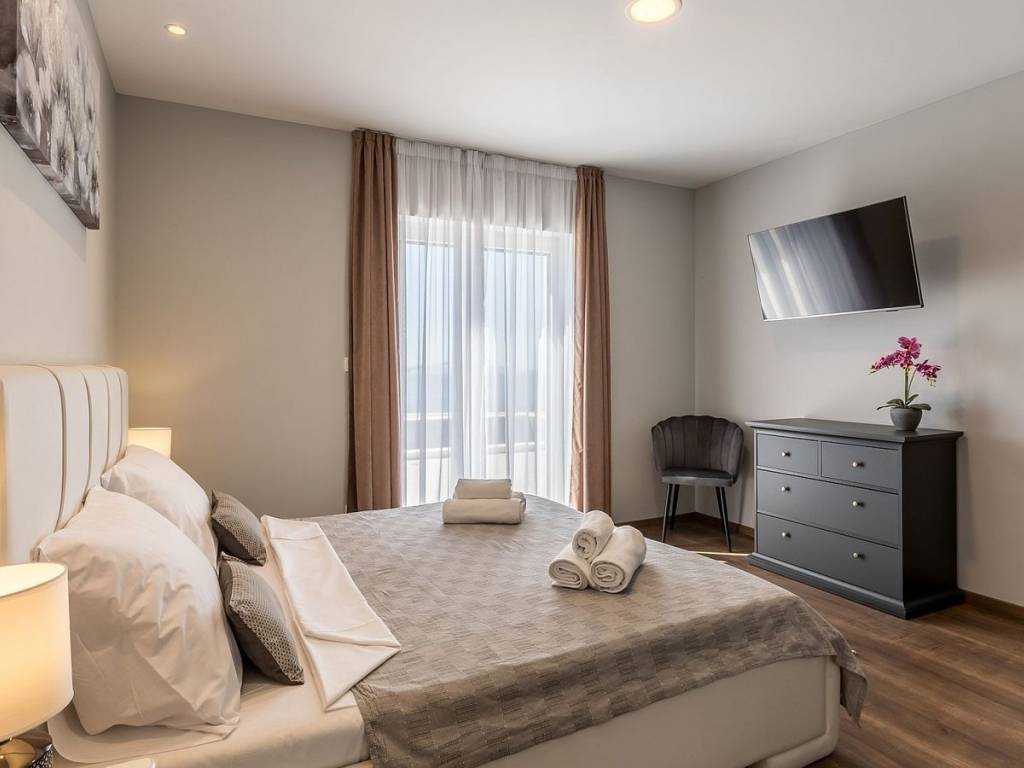 A beautiful modern villa with an enchanting panoramic view of the sea and islands is for sale. On a total of three floors, it consists of a spacious living room, kitchen and dining room, two bathrooms, five bedrooms, of which the master bedroom has a private terrace and a separate bathroom. Floor-to-ceiling windows really emphasize the view outside and ensure that the rooms are flooded with natural light. Modern furniture and good equipment make this property an ideal place for a relaxing holiday. The villa’s terrace offers a beautiful panoramic view of the sea. In front of the villa there is also a swimming pool that offers refreshment on hot days, a sunbathing area and a children’s playground. The garden is fenced, so you can enjoy complete privacy here. The property was built exclusively with the highest quality materials, the villa has solar panels, and the garage has a rainwater collection system that is used to water the beautiful garden. Located near Split, this villa offers a peaceful retreat from the hustle and bustle of life, yet remains just minutes from popular beaches, cafes, restaurants and all essential amenities. With its modern design, stunning sea views and the potential for the property to be used for tourist rental purposes, it represents an exceptional opportunity on the market worth considering.