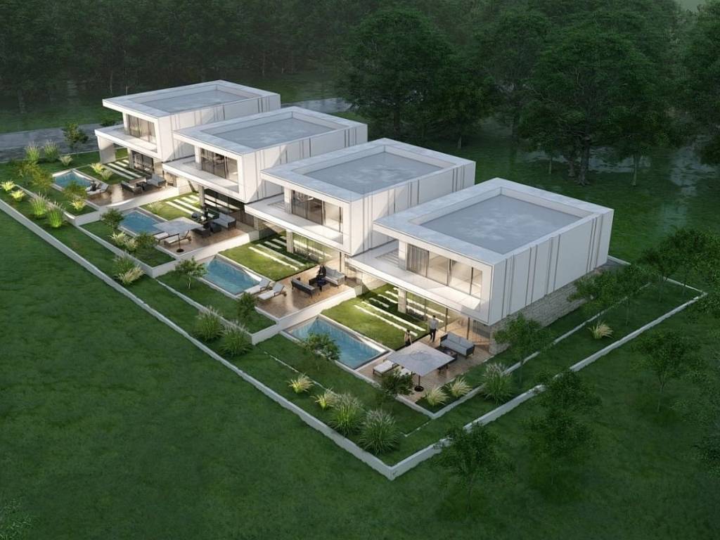 A villa for sale in a newly renovated complex with a sea view. The villa extends over two floors with a usable living space of 128 m2.   The villa’s grounds consist of parking, green areas, an uncovered terrace and a 24 m2 private swimming pool. The main entrance to the house leads to the ground floor, which consists of common rooms such as the kitchen, dining room and living room, a shared toilet and a bedroom. The staircase leads to the upper floor, which consists of two spacious bedrooms with private bathrooms and a dressing room.   The rooms offer direct access to a shared terrace with a sea view.   Due to the large glass walls, natural light is available throughout the day.   The macro location of the property is an excellent choice for families escaping the big city, while also being close to the same, the airport and the beaches. The micro location provides privacy, proximity to kindergartens, schools and supermarkets, all in a new area with newly built properties and a landscaped environment and rich horticulture.
