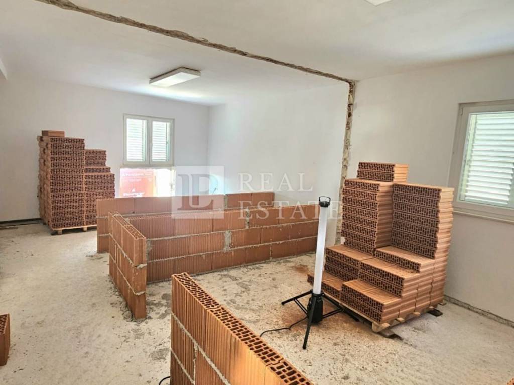The apartment is currently under construction and consists of a living room, kitchen, dining room, bedroom, bathroom, balcony and uncovered terrace. The living room leads to a smaller balcony with a partial sea view, and the bedroom and dining room lead to a spacious terrace of 114.08 m2 (there are two exits to the uncovered terrace).