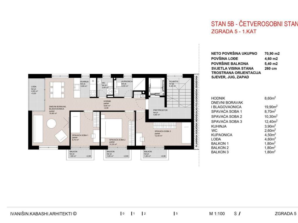Sastoji se od: tri spavaće sobe, kuhinje , boravak, blagovaonica, kupaonica, wc,lođa i tri balkona