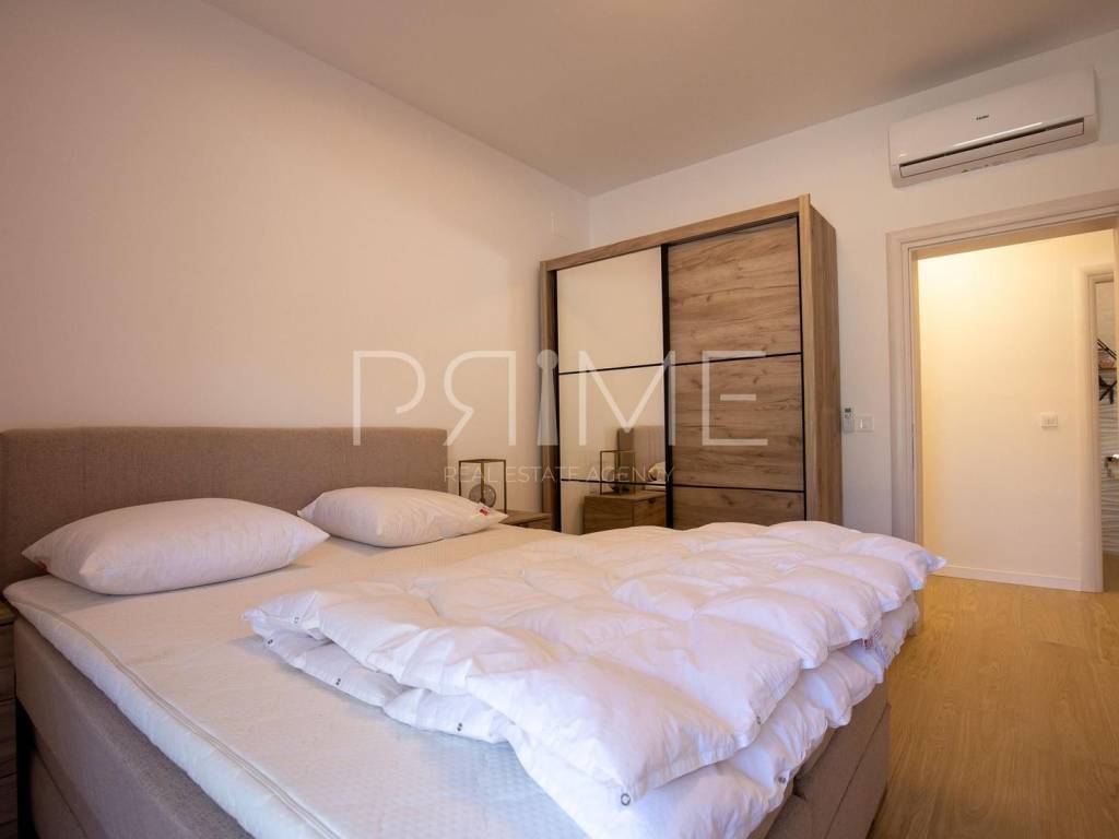 Stan površine 116 m2 sastoji se od od kuhinje, blagovaone, dnevnog boravka, dvije spavaće sobe, kupaonice, wc-a i dvije natkrivene terase. Pripadci stana su vrt i parking. Nalazi se na odličnoj lokaciji udaljenoj od mora i plaže 150 metara. Prodaje se kompletno namješten i opremljen.  U izgradnji su korišteni pototherm block, 10 cm sitropor fasada, povc stolarija, električne rolete, komarnici, svaka prostorija je klimatizirana.... energetski certifikat A. S terase se pruža pogled na more i Velebit. Više informacija na upit!