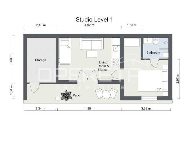 It consists of a spacious living room with kitchen, bedroom and bathroom (29.56 m²), covered and fenced terrace (8.69 m²) and storage room (7.48 m²).